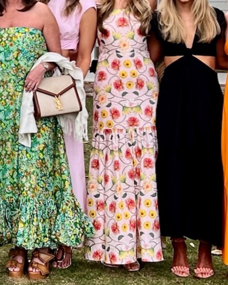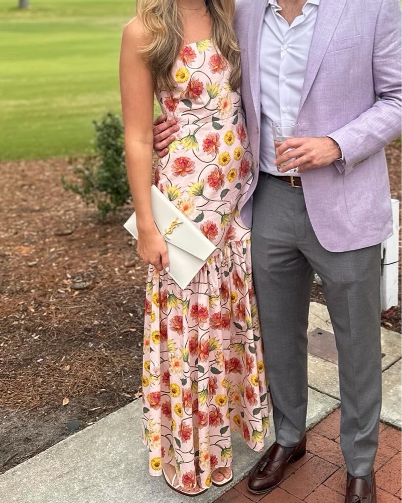 Worn once and so pretty! Drop waist detail and adjustable straps. I’m 5’10 and it’s floor length on me