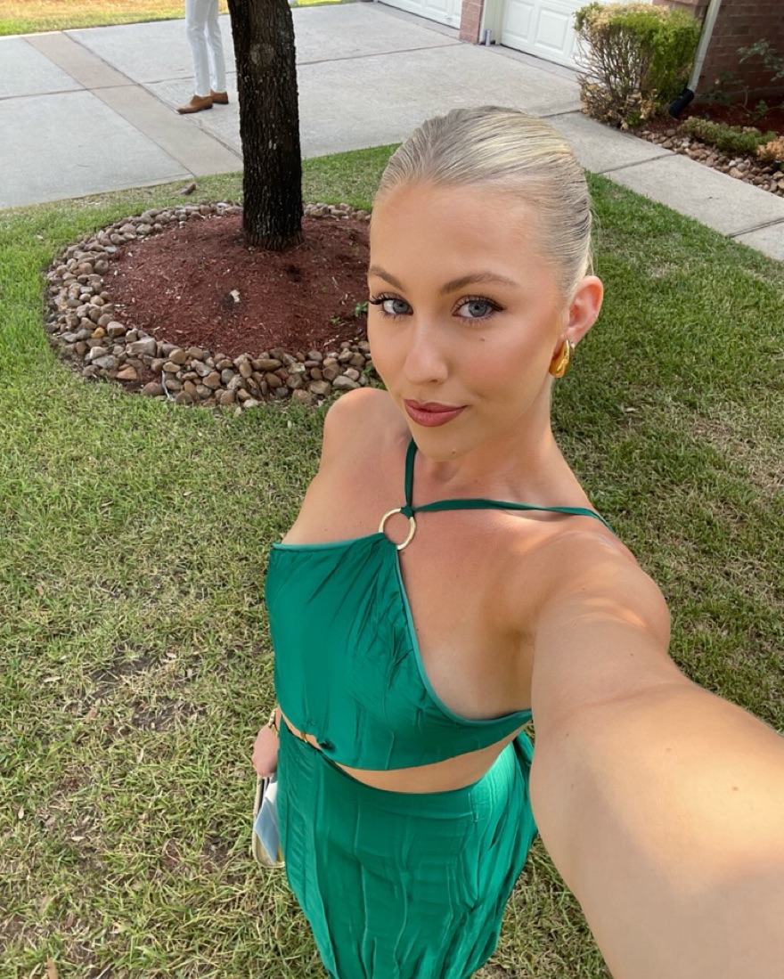 Pleated bottom, adjustable tie back waist, gold hardware. I’m 5’10!