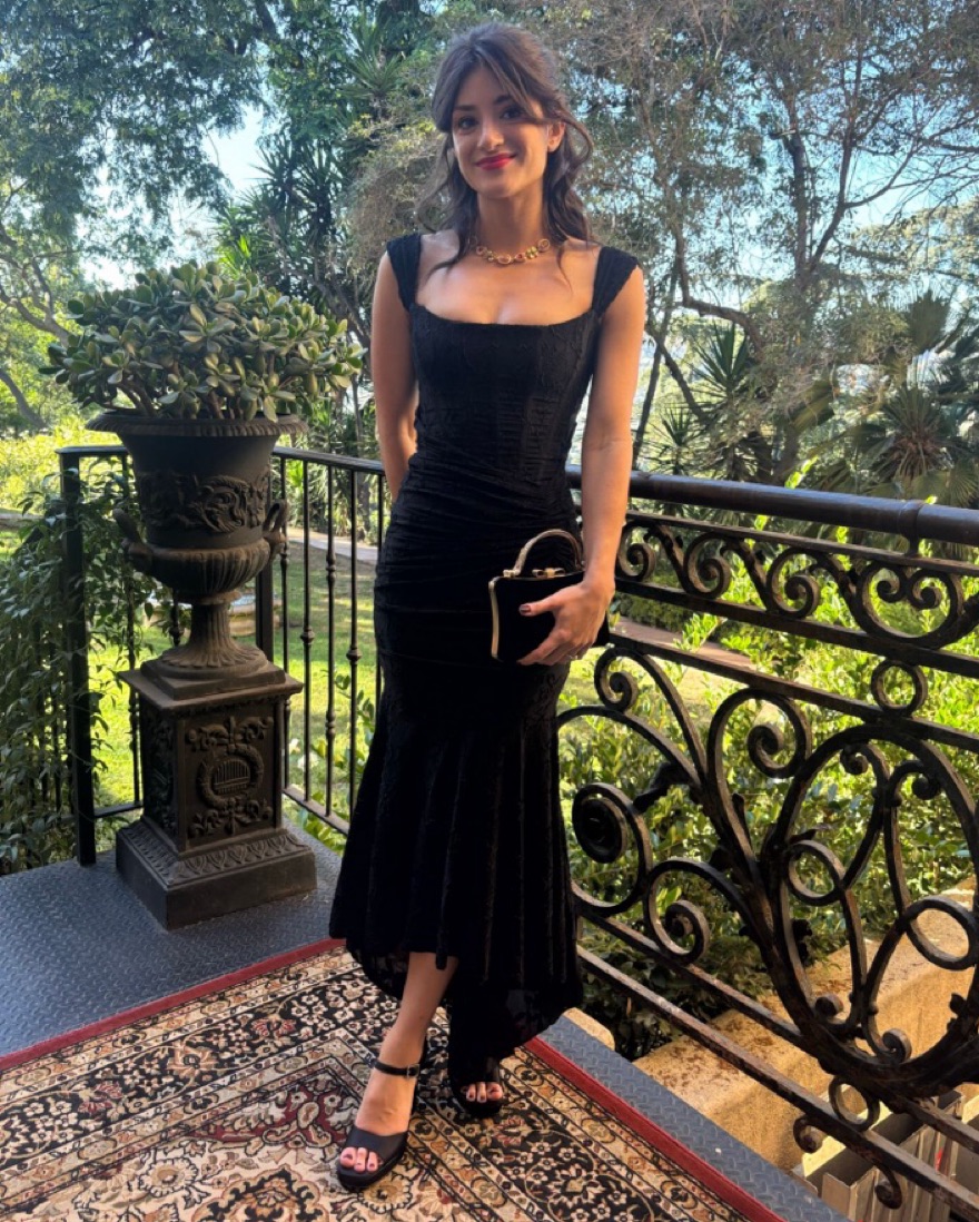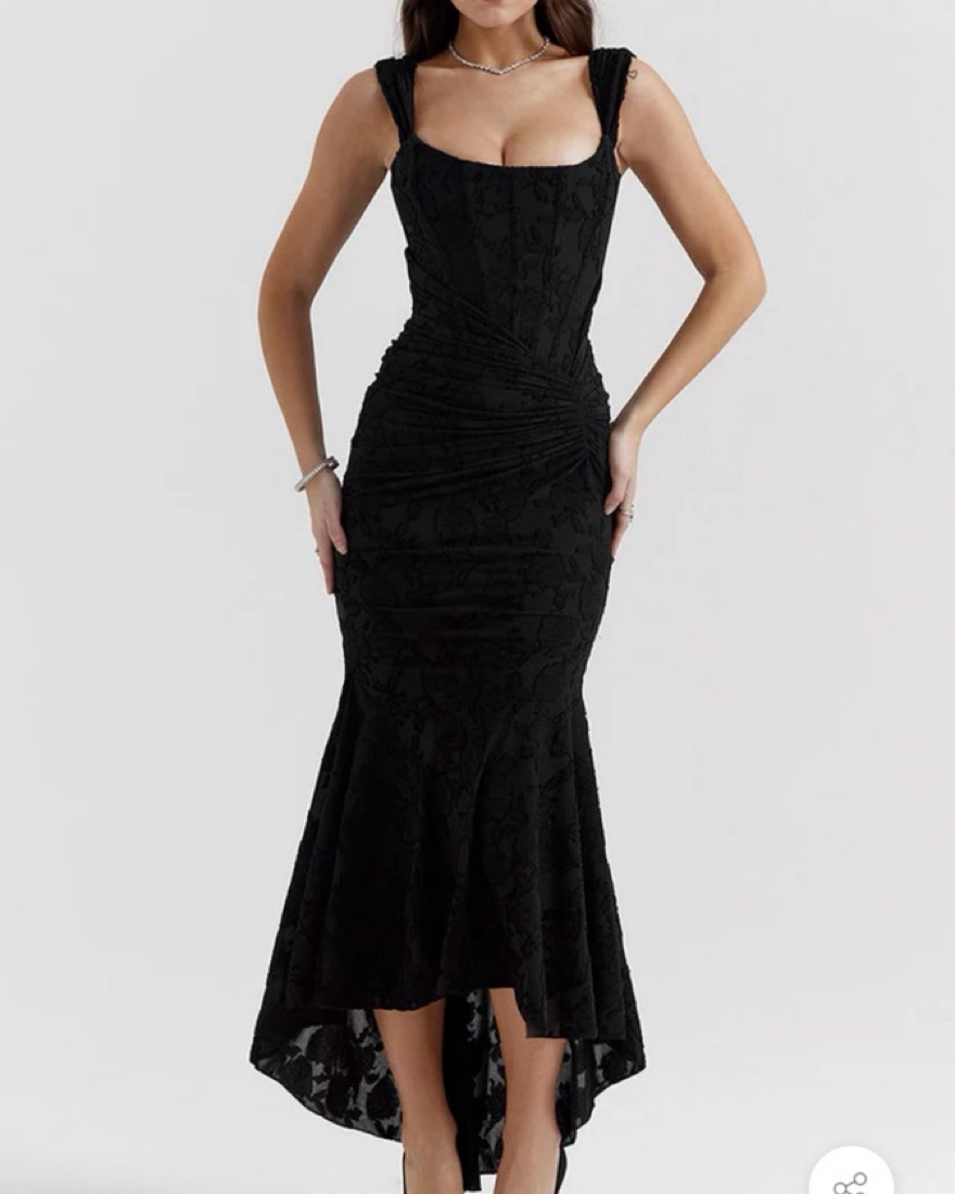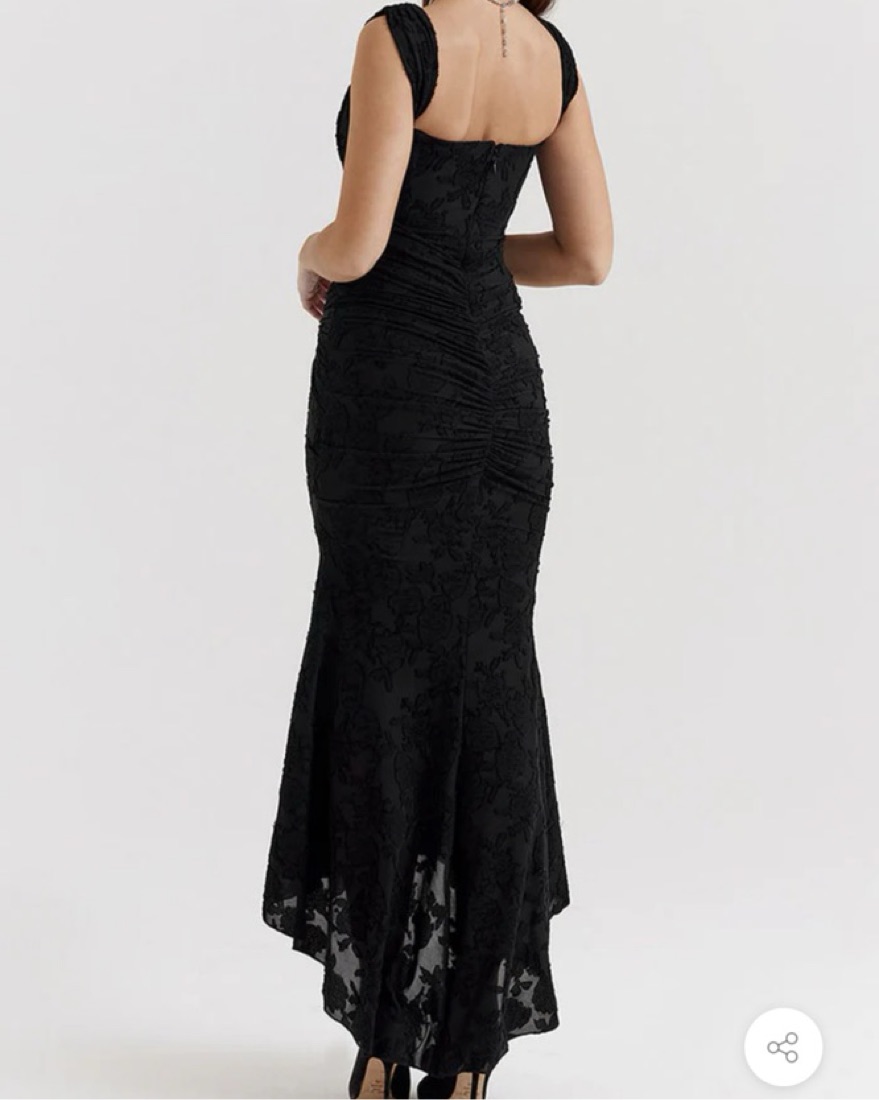 Stunning form fitting black dress with flower and lace detailing. Corset style waist and bust. Can wear the straps off the shoulder or on. I’m 5’4” and 115 lbs, size XS in this dress