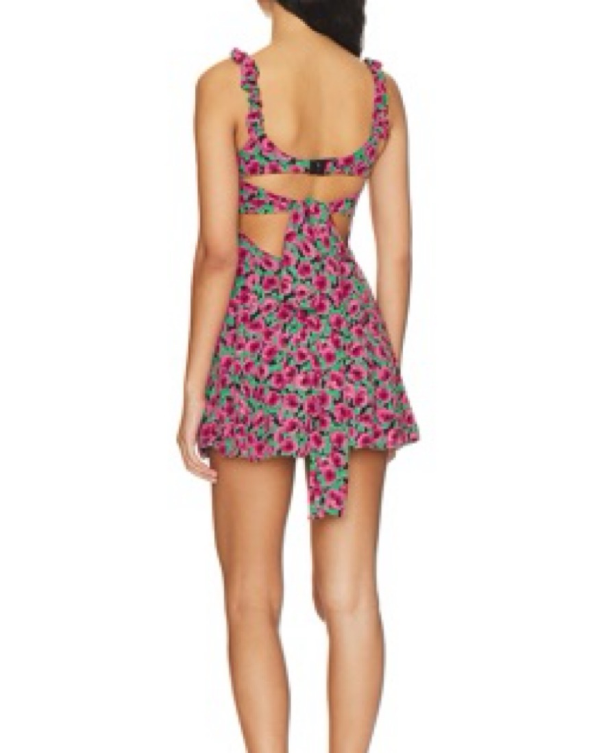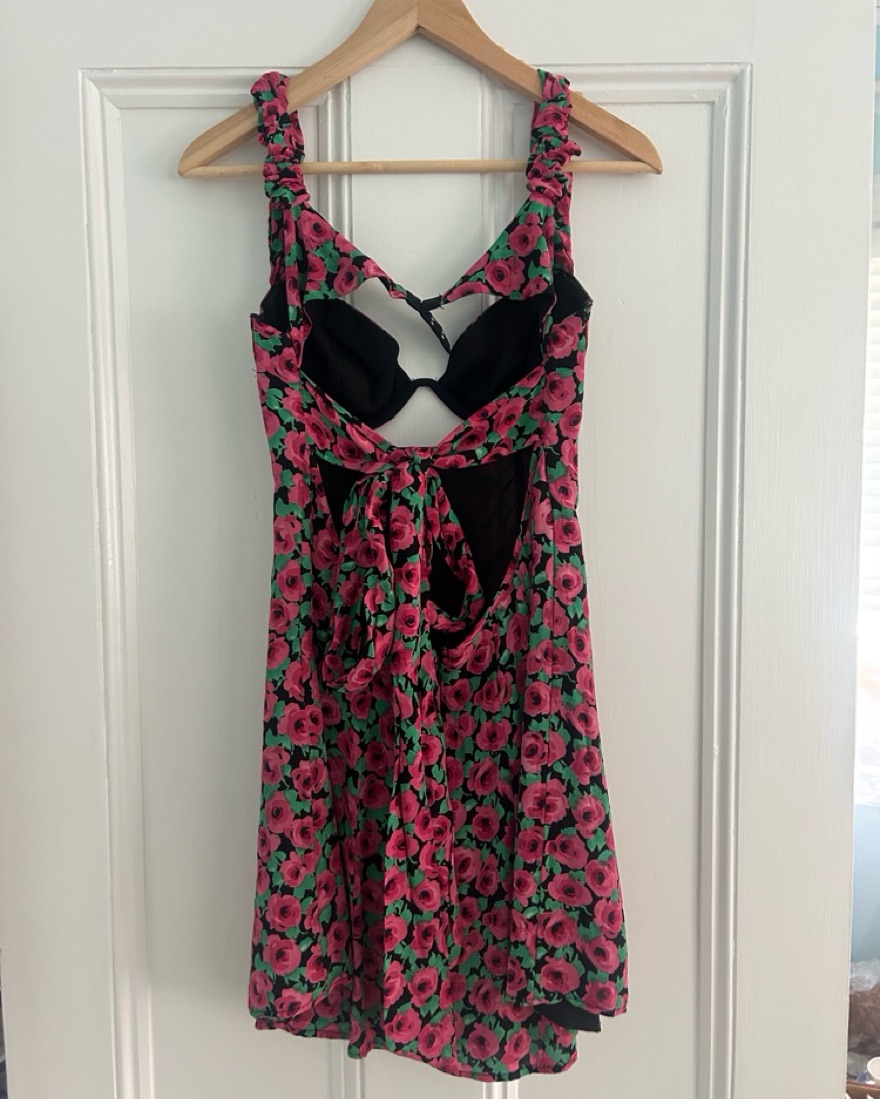 Pink, black, green floral mini dress with hook clasp, underwire and back tie