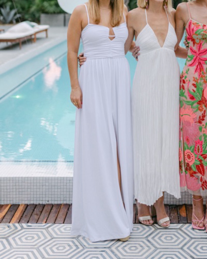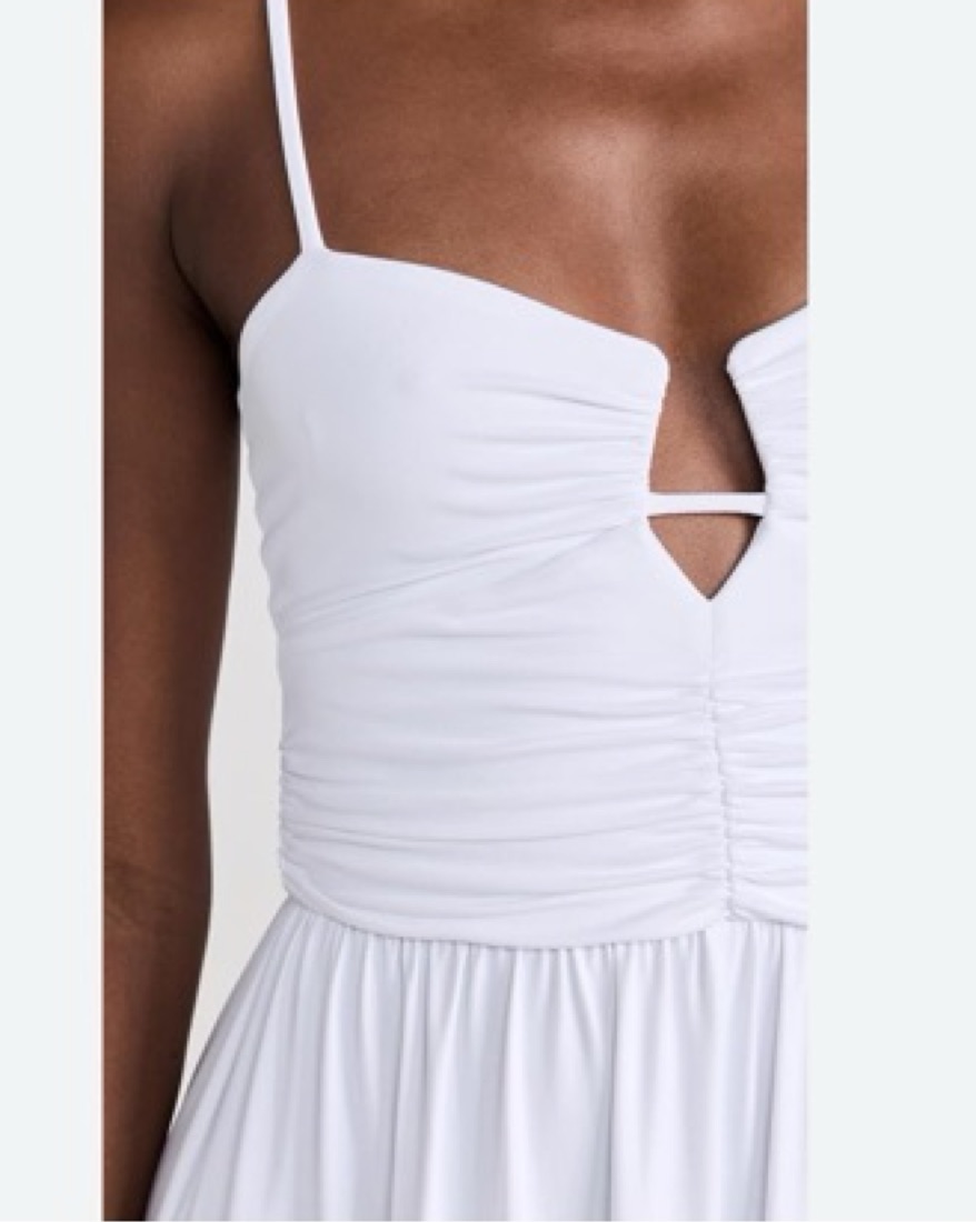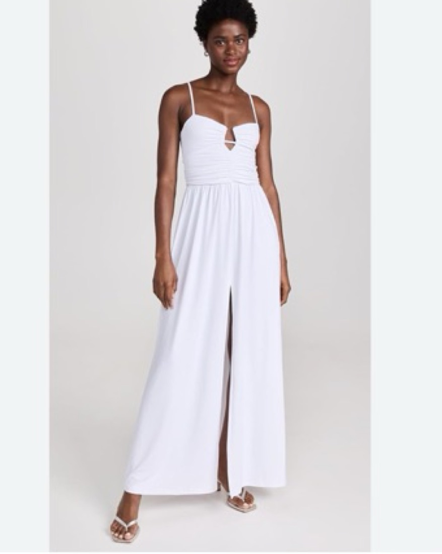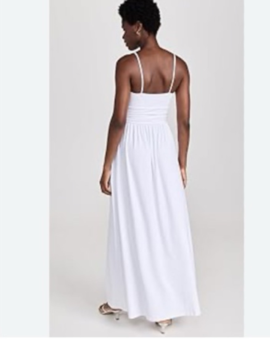 Fabric: jersey, sweetheart neckline with wired cutout and fixed straps. Thigh-high front slit. No closure (pullover). Lined bodice, unlined skirt. VERY comfortable. Size small (I’m between Sm/Med and wear a B cup - Small was perfect).