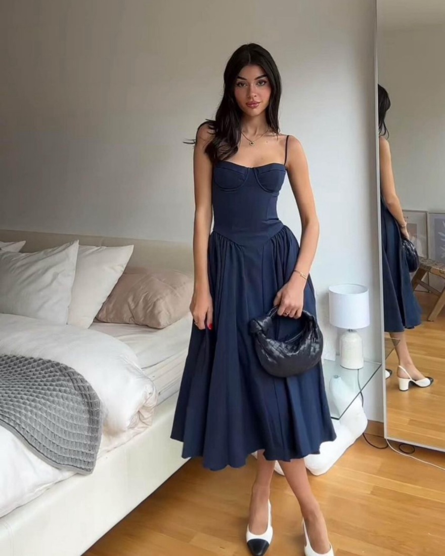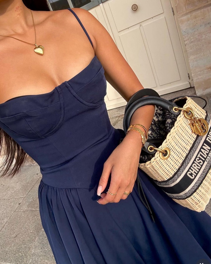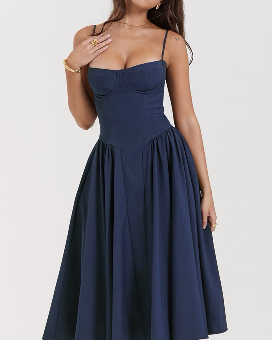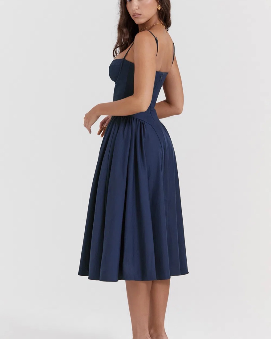 Cut from a breathable twill fabric, it's boned through the bodice to cinch the waist and has a sweetheart neckline with underwired cups.