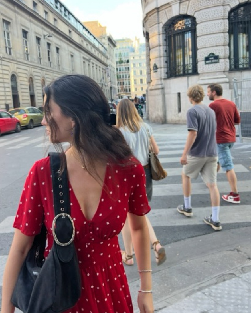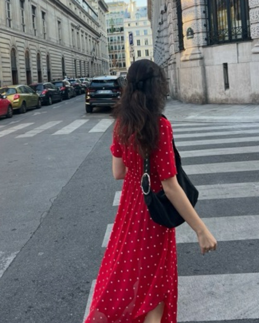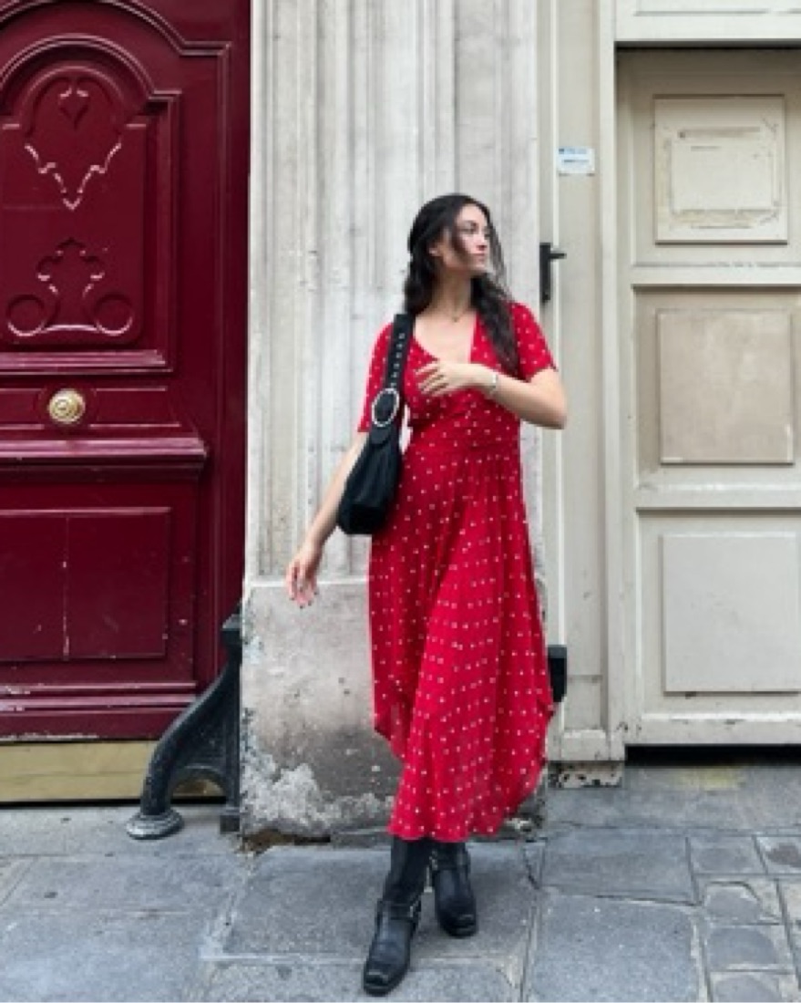 Red polka dot chiffon dress from Maje. Nude shorts / shape wear recommended
