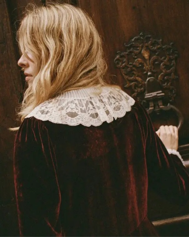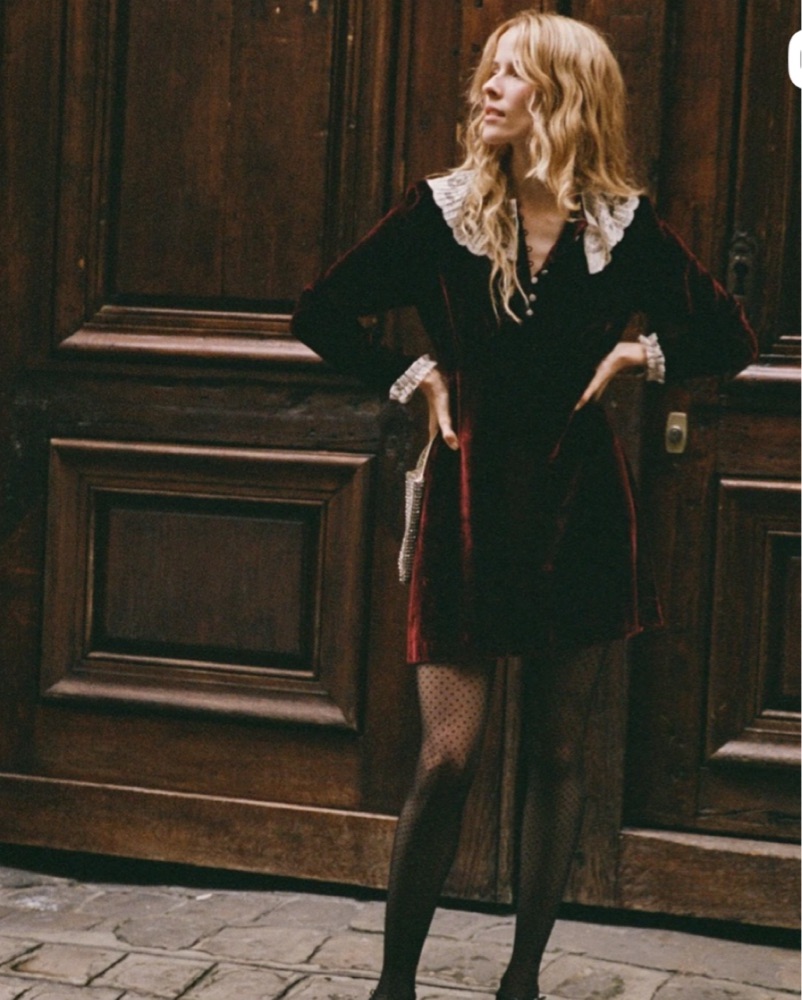 This is the perfect dress for Blair Waldorf Holiday vibes. 60s inspired, it features an empire waist, silk blend red velvet, silk organza and lace accents, and rhinestone buttons down the front. Features an invisible side zipper.