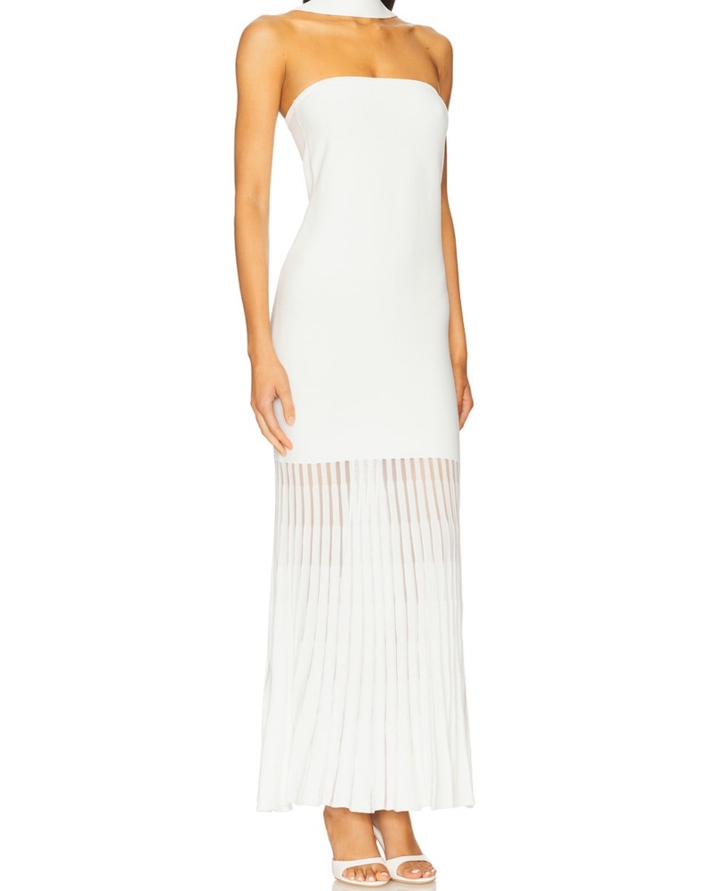 White dress with more transparent fabric from the knees down. High neck strap. Worn only once. Please dry clean before return.