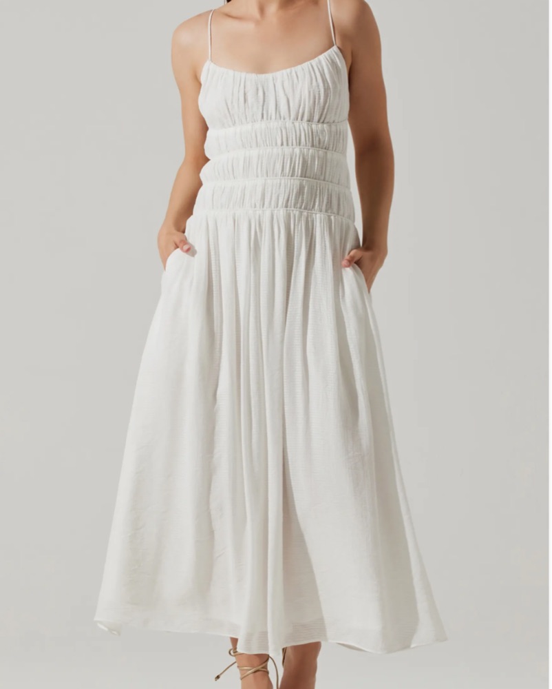 Breeze through your weekend in this A-line sundress fashioned with handy pockets and a shirred bodice accented by romantic back ties.