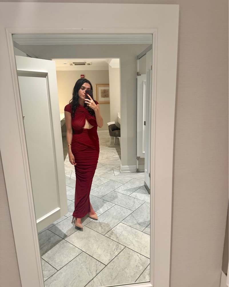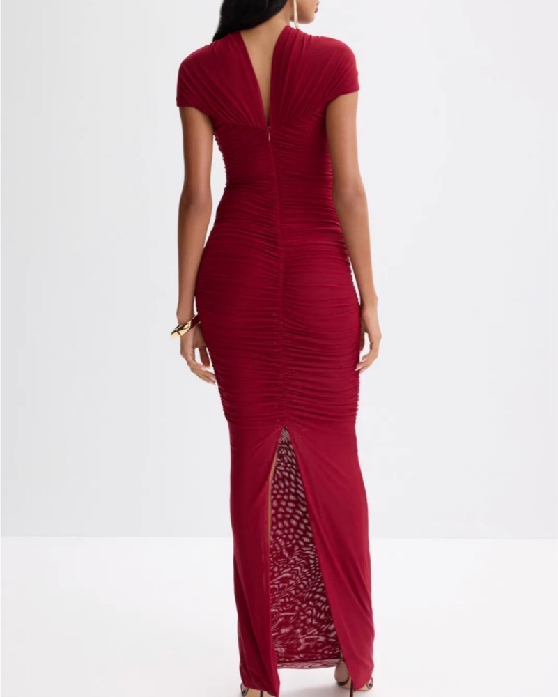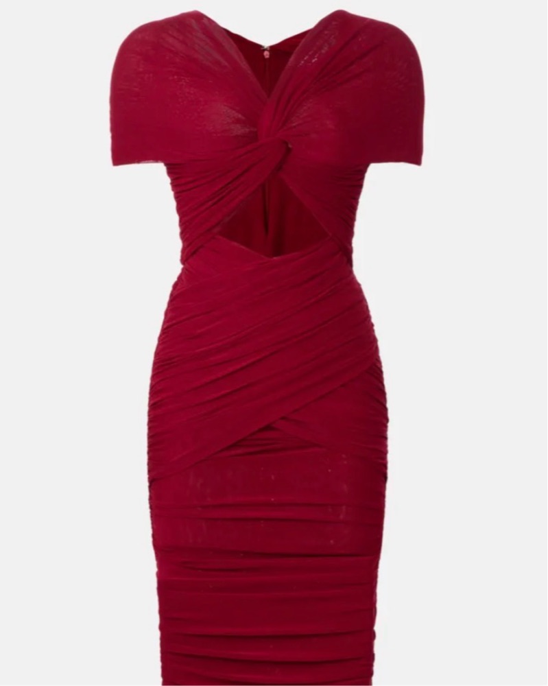 The Ronny Kobo Nasha Dress turns heads with its sculpted fit and gathered detailing. Style it with metallic kitten heels and a structured mini bag for an elevated evening look.