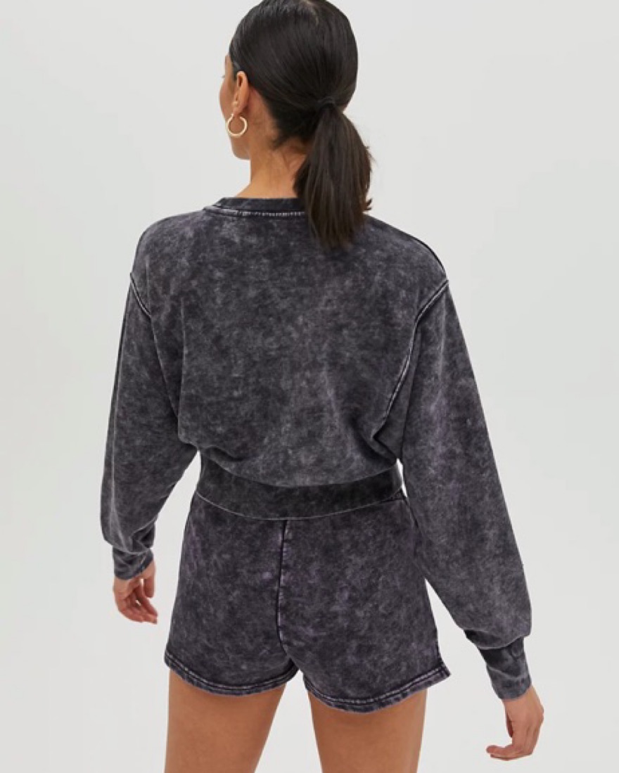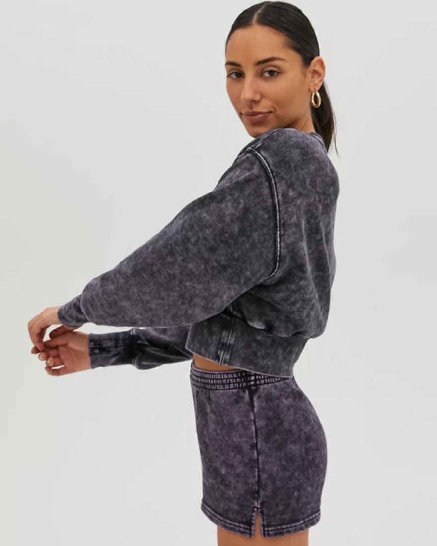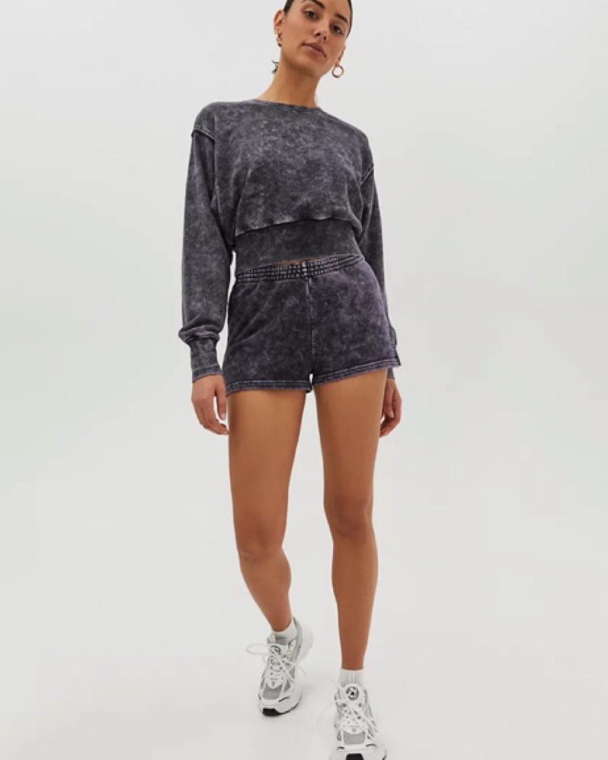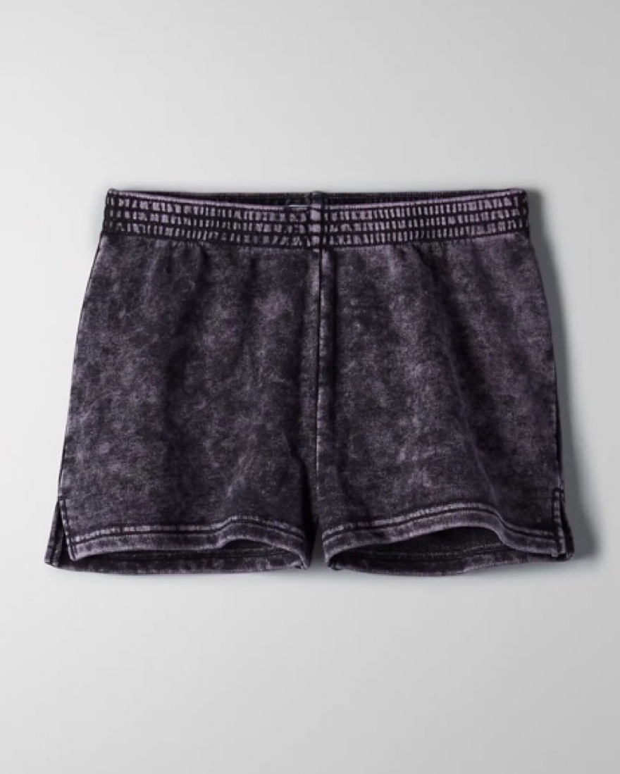 These are pull-on sweat shorts with side slit details and Tna's signature Spiro graphic. They're made with Tna's Lightweight Fleece — drapey terry that’s super soft to the touch. This version of the Boxer Short comes in an acid wash overdye. Color is a Pale Violet/Black