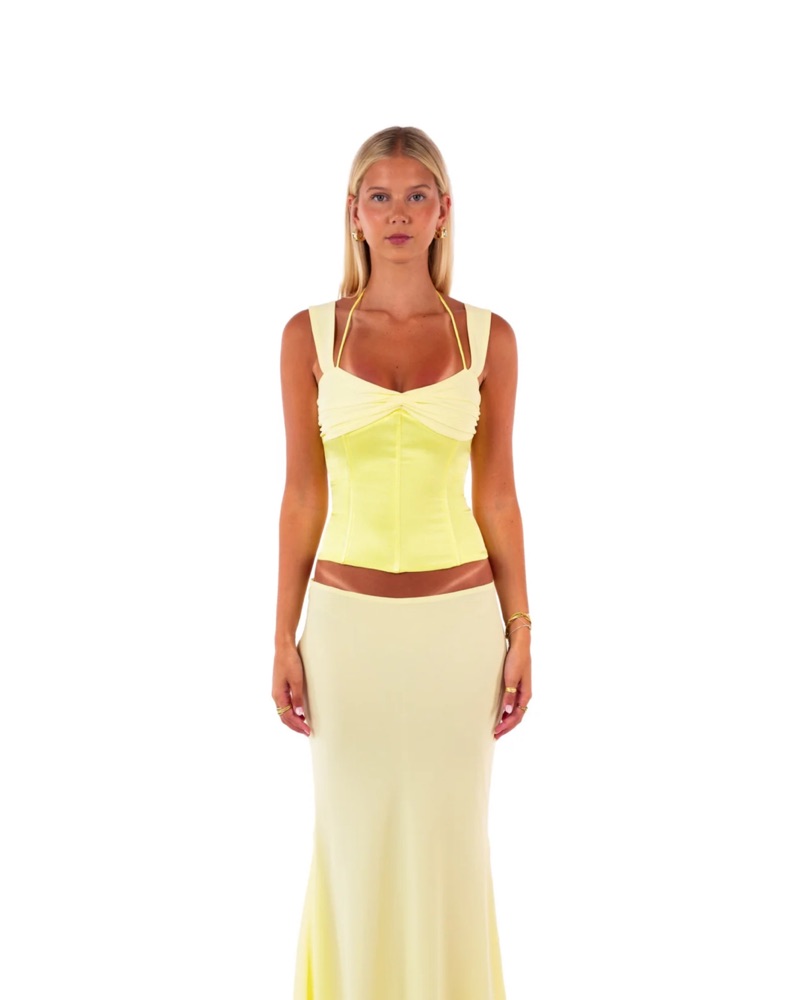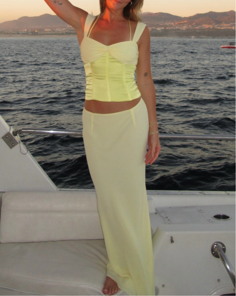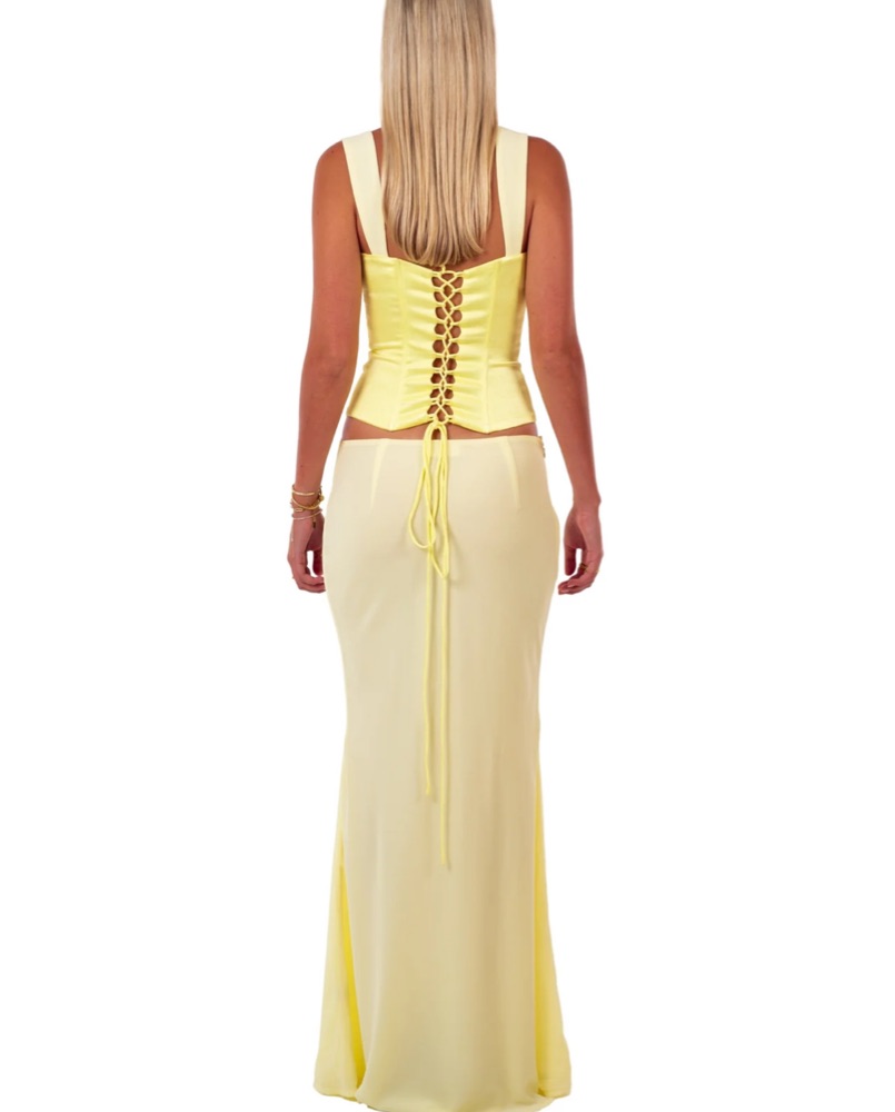 Most flattering yellow set. Adjustable corset back. Skirt was hemmed shorter to wear with low heels ( I am 5’4)