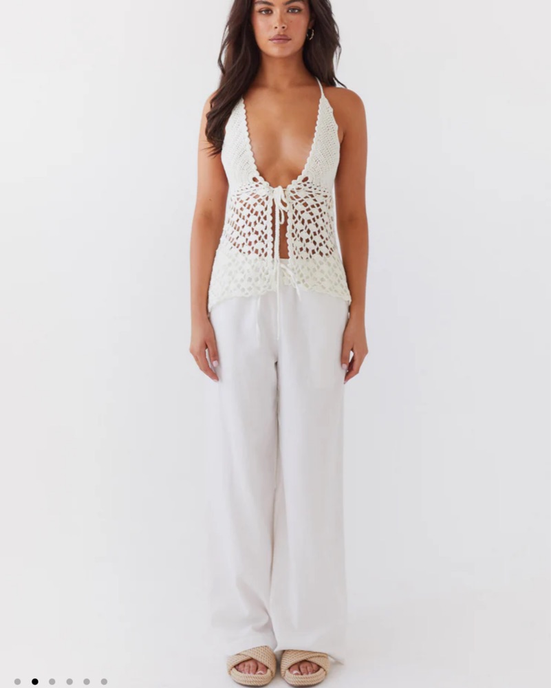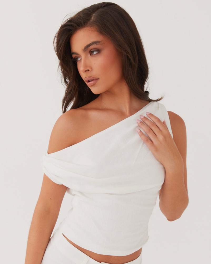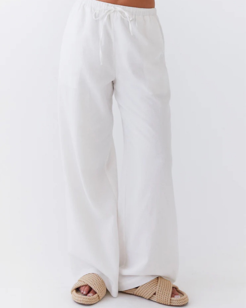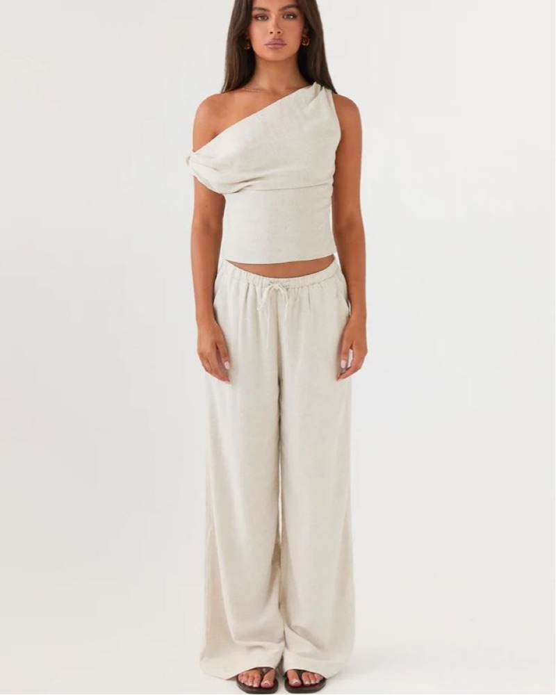 - Wide leg pants - Adjustable drawstring - Twin hip pockets - Oversized fit - 45% Linen 55% Cotton - One shoulder top - Invisible side zipper - Cropped length - Lined - 45% Linen, 55% Cotton