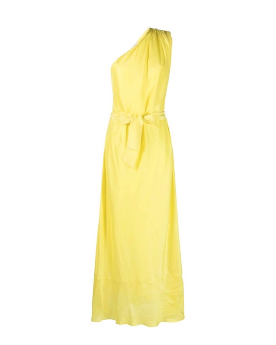 Worn once. One shoulder with subtle shoulder pad. Tie around waist to adjust.