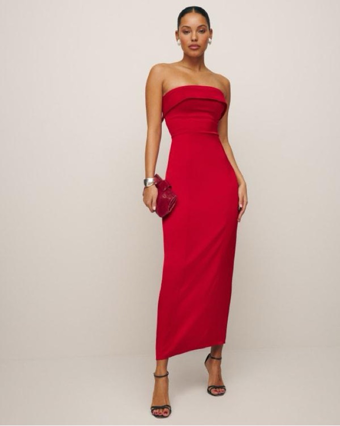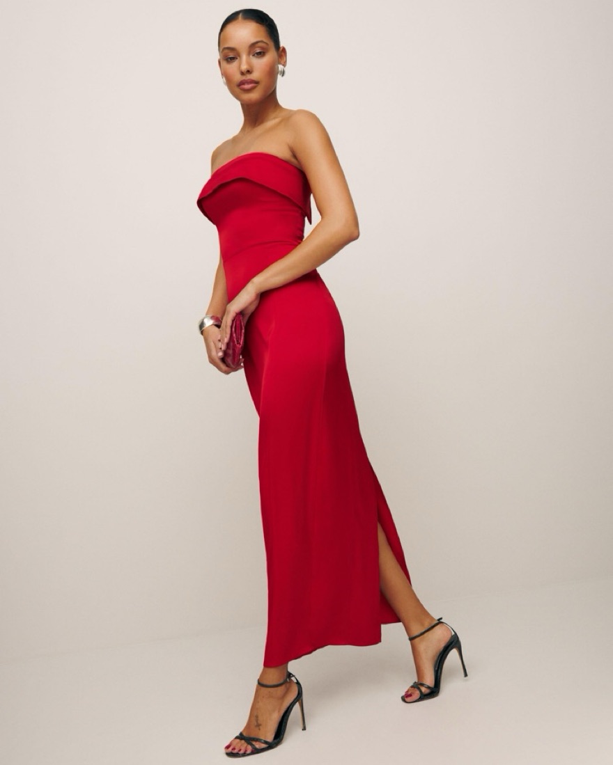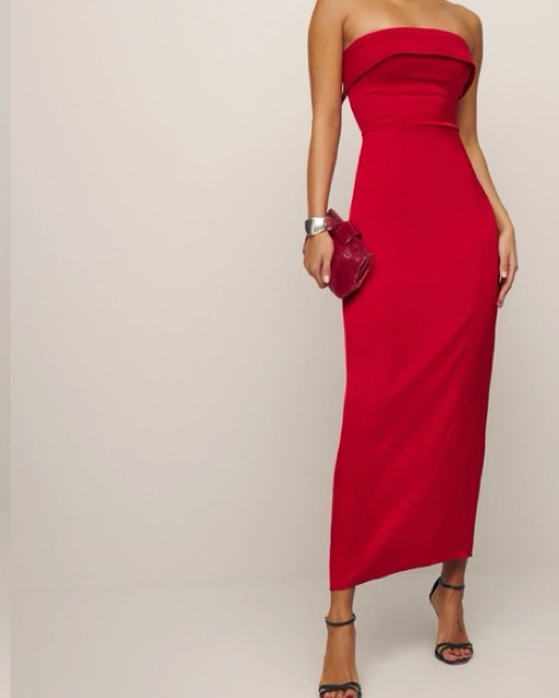 Red long sleeveless dress in satin from Reformation. Currently new with tags.