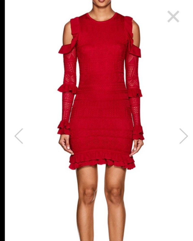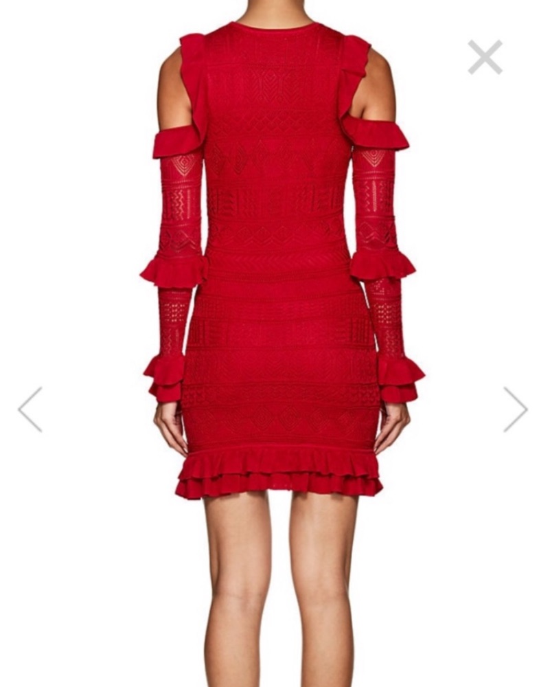 Red Ronny Kobo long sleeve stretch pointelle knit cold shoulder dress. Ruffle detail on sleeve. Nice for holiday season