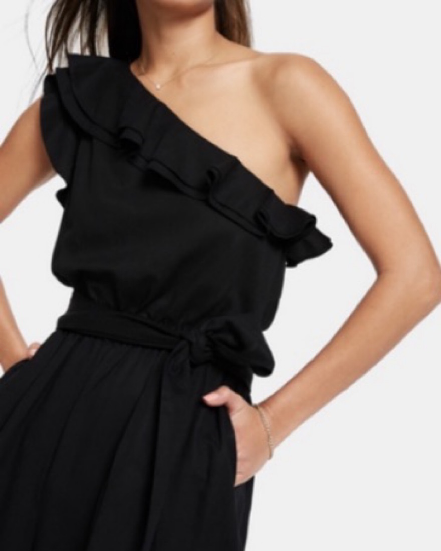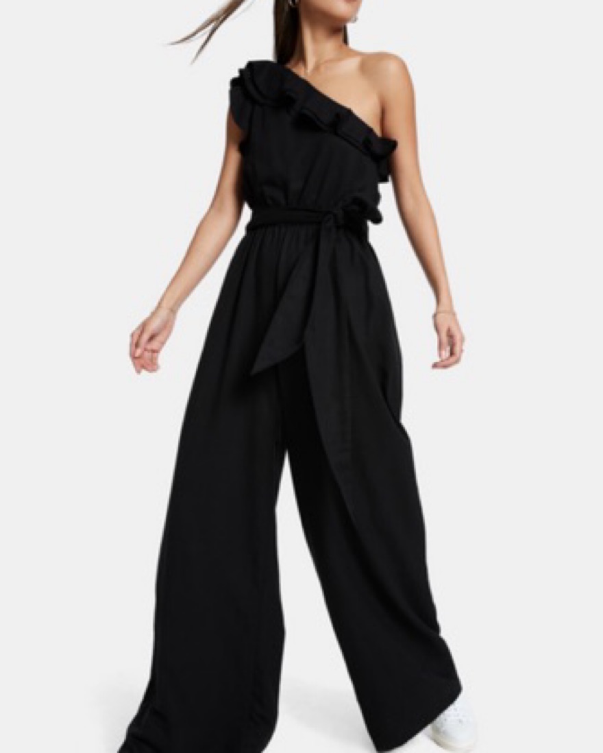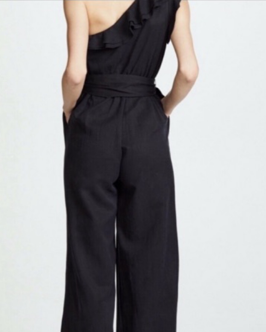 Ulla johnson demi twill jumpsuit in black. Asymmetrical/one shoulder ruffle sleeve, wide leg, sash belt (removable), pockets. Super comfortable and can be dressed up or down.