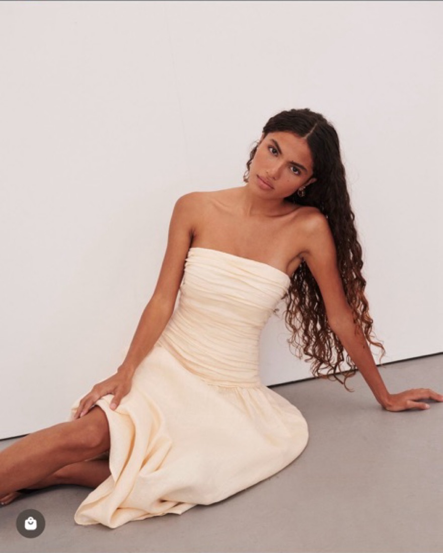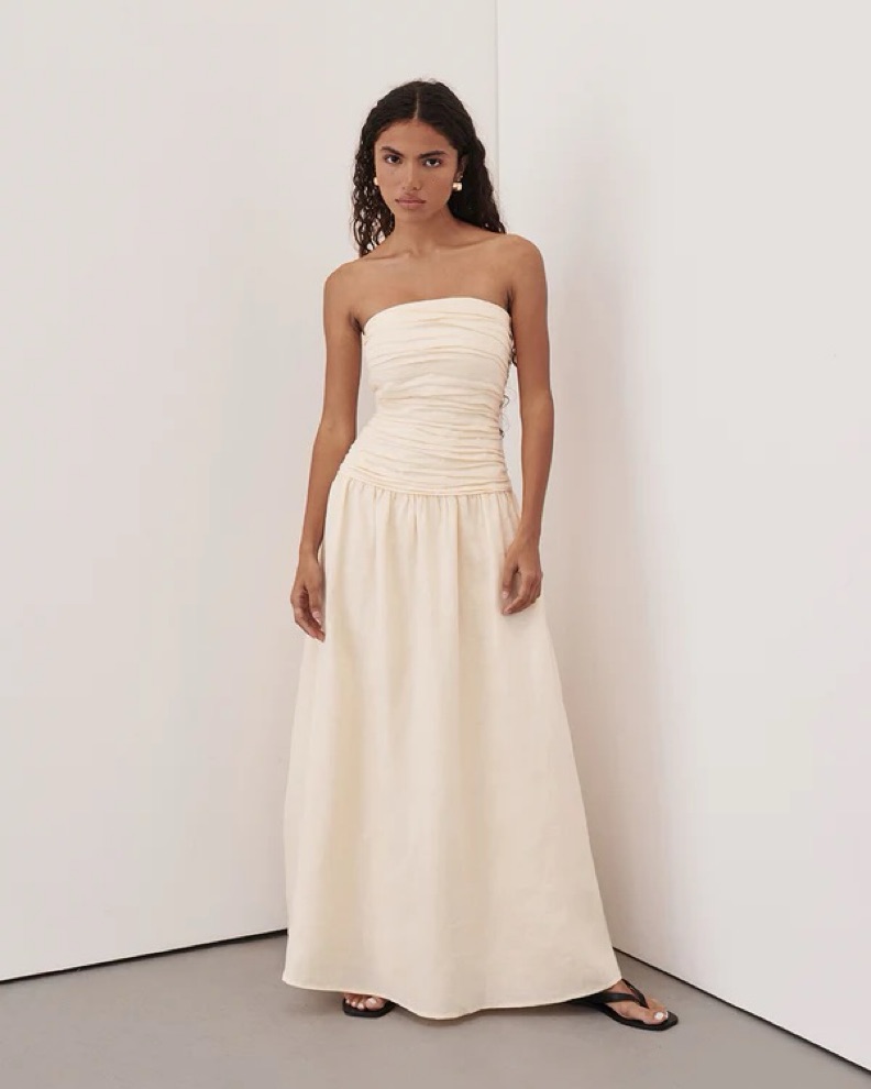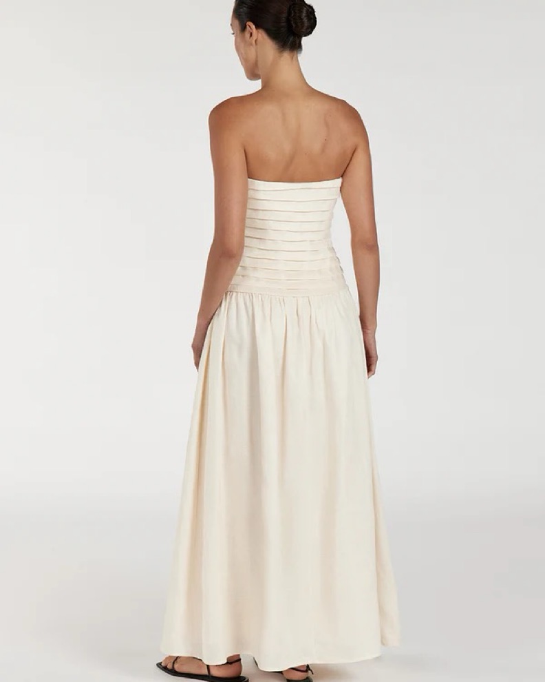 Dissh catania cream linen strapless midi dress (US 2 / XS). Strapless linen dress with pleated details, drop waist and circle skirt. I’m 5’3 and it hits my ankles - easy dress to wear to the beach / on vacay! 100% linen so no stretch to it