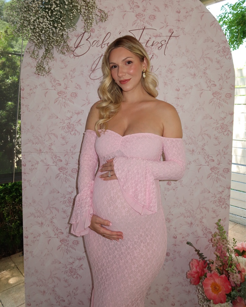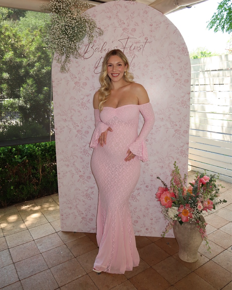 I’ve never gotten so many requests to buy a dress off of me! I can’t part ways for sentimental reasons BUT willing to rent it out since it’s always sold out 🤍 the fabric is super stretchy, ***double lined*** lace, incredibly flattering especially with a bump