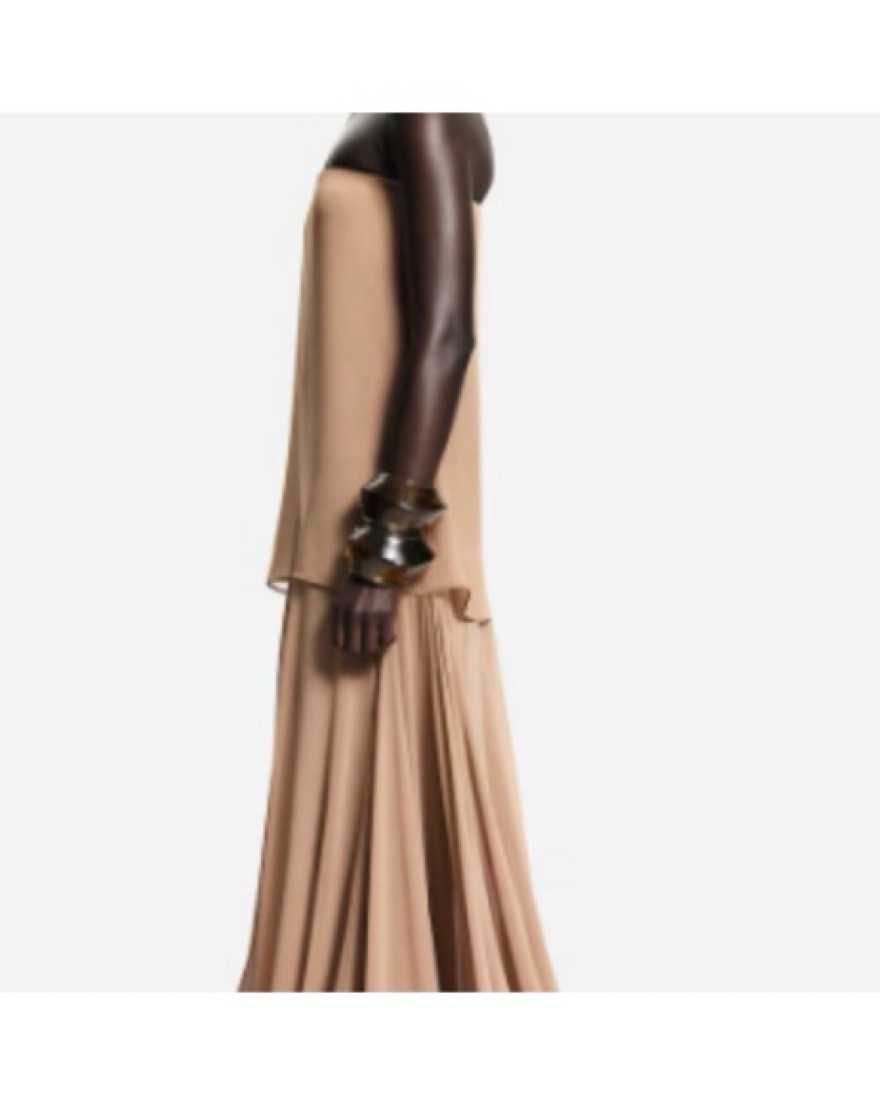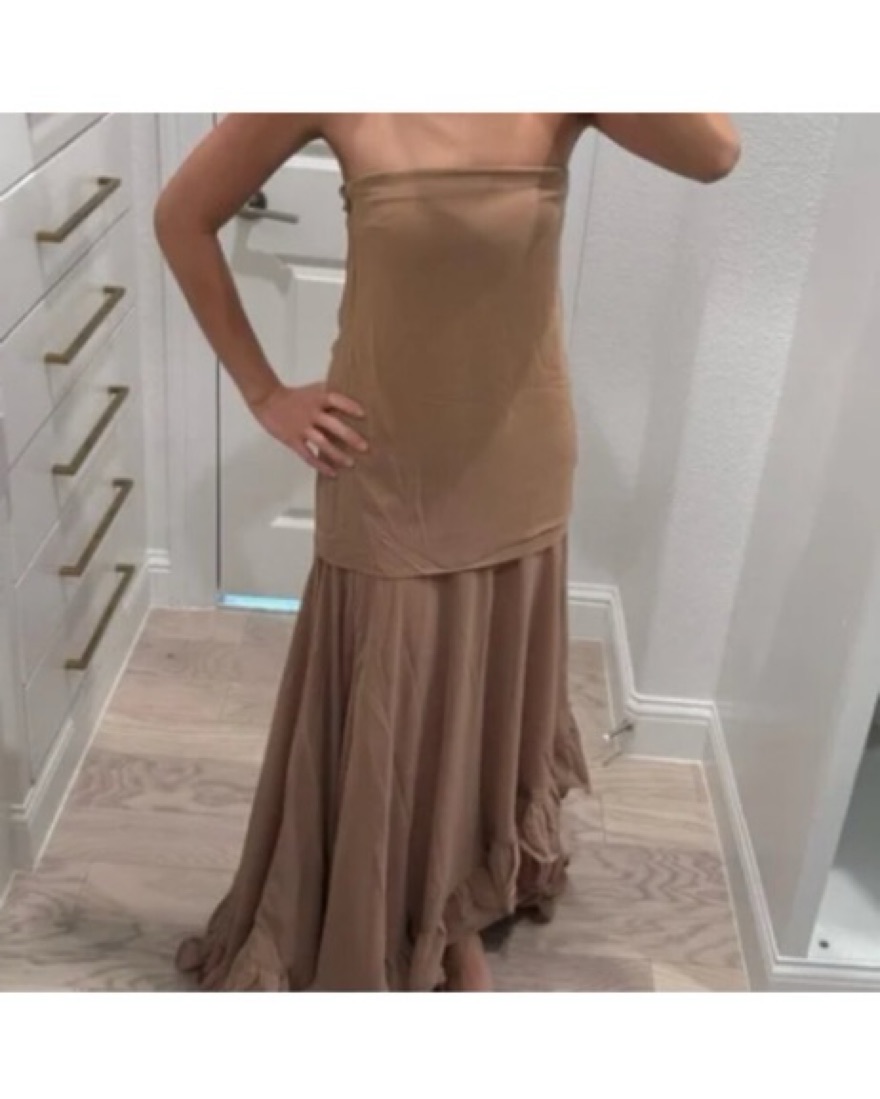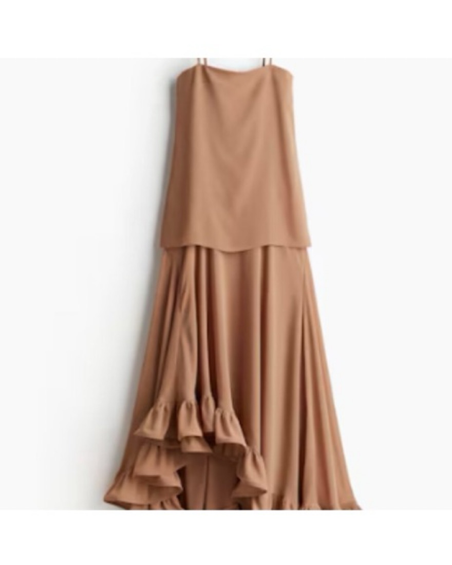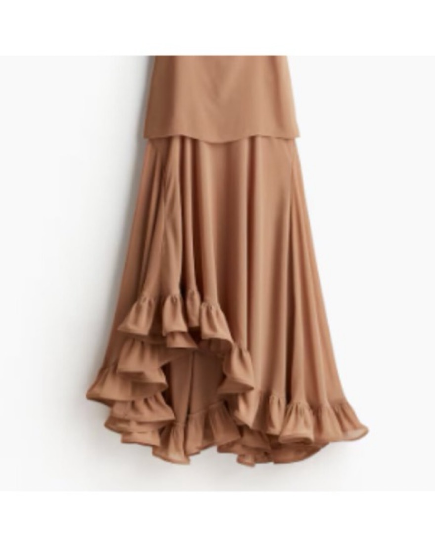 This stunning camel-colored maxi dress is perfect for a formal event or special occasion. The ruffled details and flowing silhouette create a chic and sophisticated look.