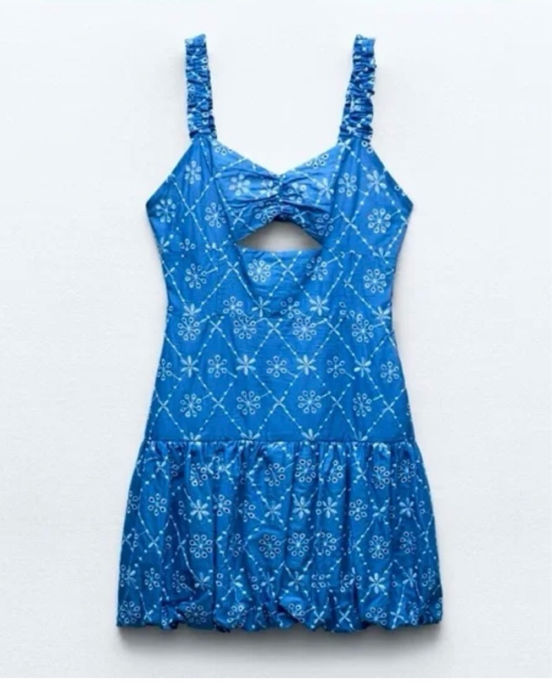 Zara, size small, blue, embroidered, bubble skirt dress, balloon hem dress, mini dress, short dress, summer dress