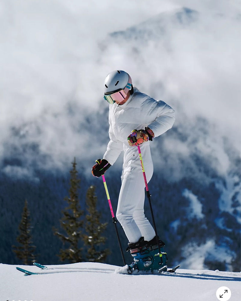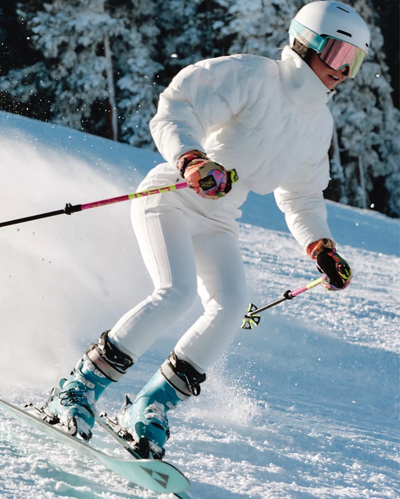 The perfect puffer combo, this ski suit features a warm, waterproof fabrication with a puffer silhouette top and flattering, fitted bottom with an ultra-high elasticated waistband and wide ribbed collar.