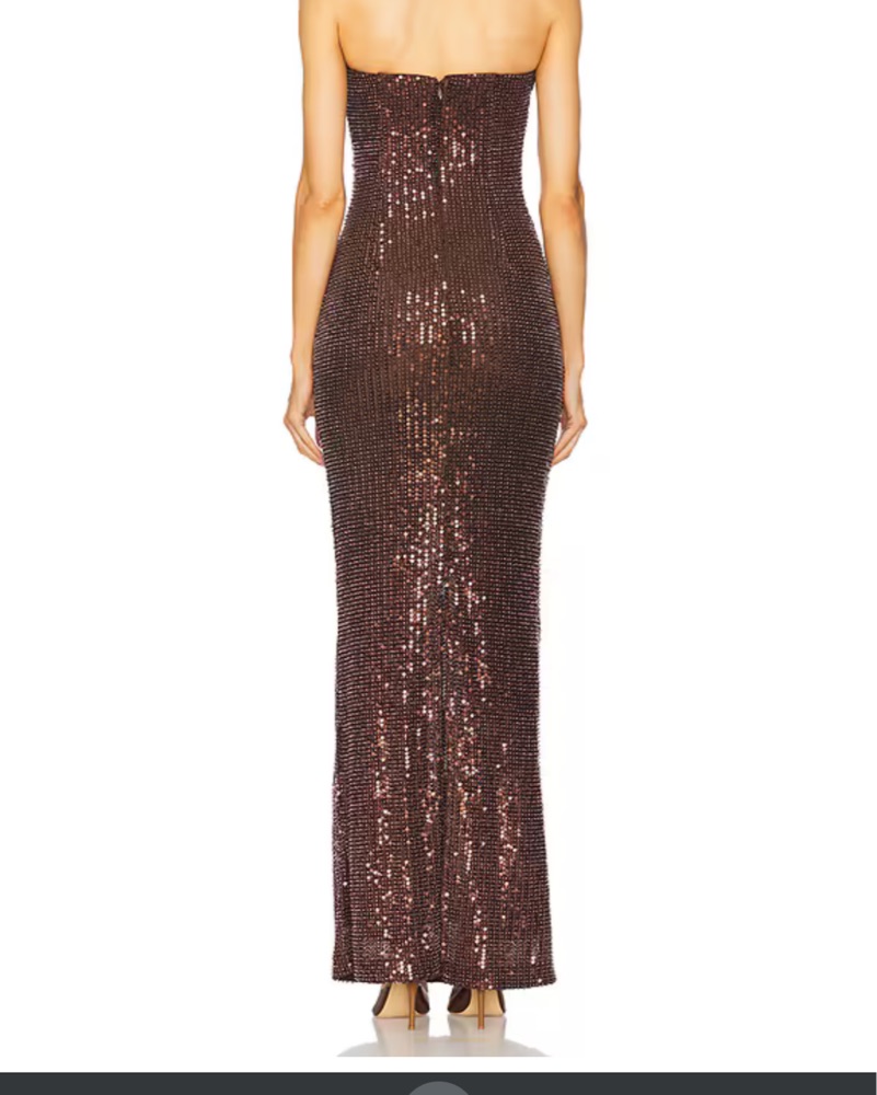 Only worn once. Gorgeous Michael Costello brown strapless gown with sequins and beading. Super comfortable with back zipper and slight stretch. Very long, must be 5’7 or taller to rent.