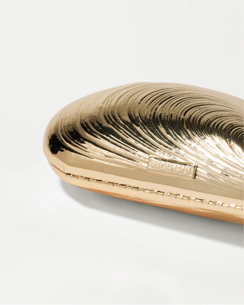 The Bridget Metal Oyster Clutch in Gold. Inspired by the natural beauty of the sea, this hard shell clutch cast from metal features a stunning oyster shell design. The lustrous finish and intricate detailing create a captivating and luxurious look. Lined interior, and removable chain shoulder strap.