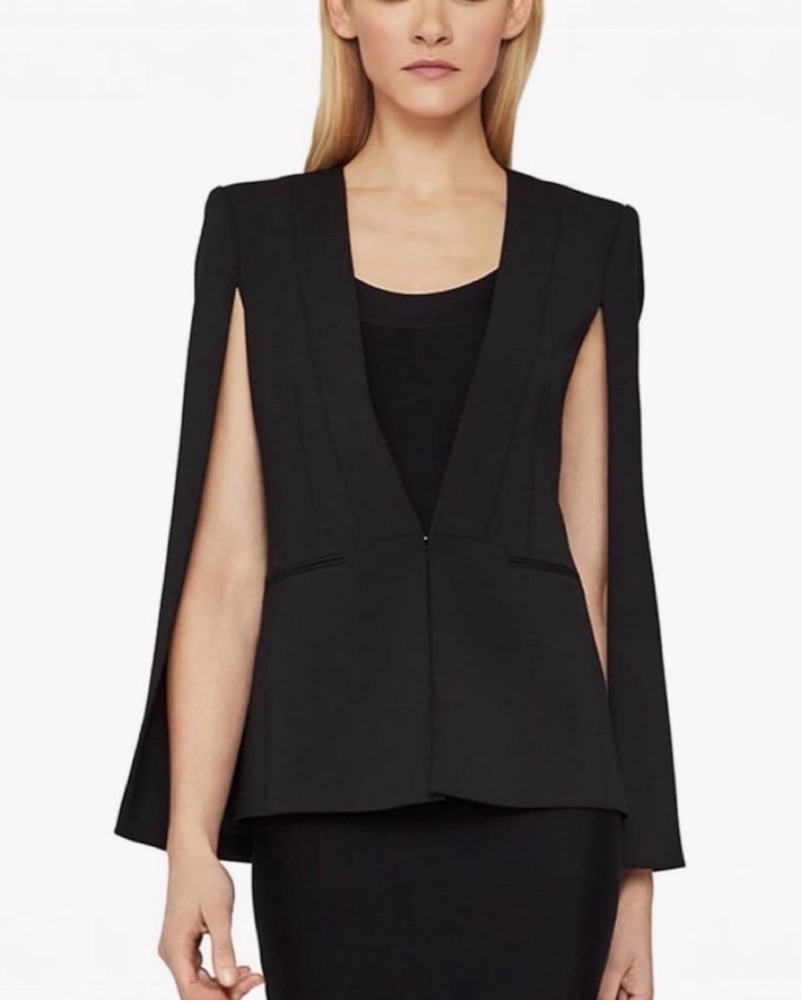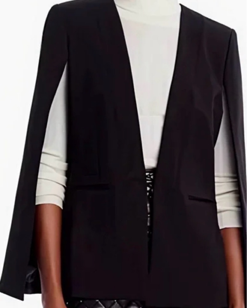 This sophisticated black cape blazer is perfect for a refined, modern look. Wear it to the office or a special event for a polished, stylish appearance.