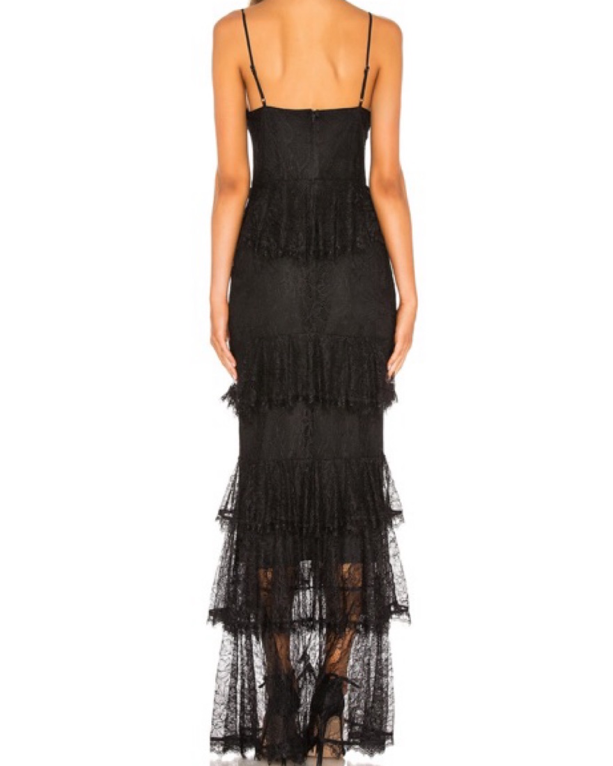 This stunning black lace gown is perfect for a formal event or special occasion. The intricate lace detailing adds a touch of elegance, while the thigh-high slit creates a daring allure.