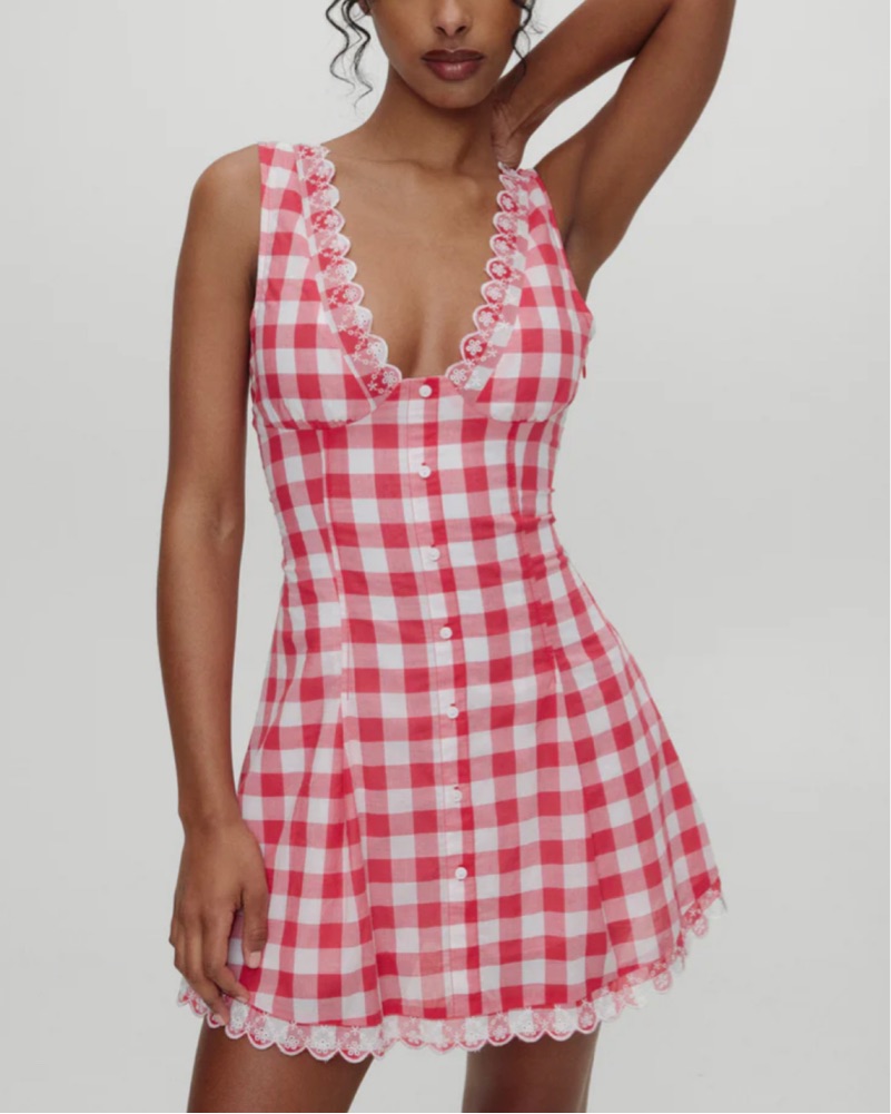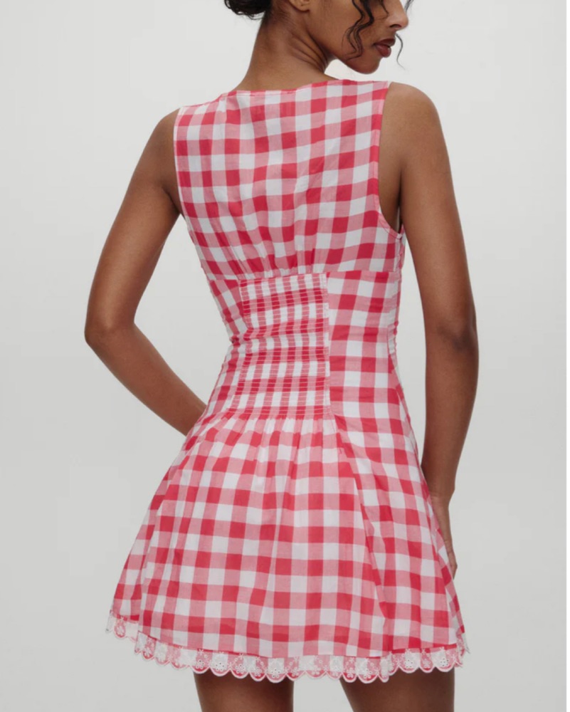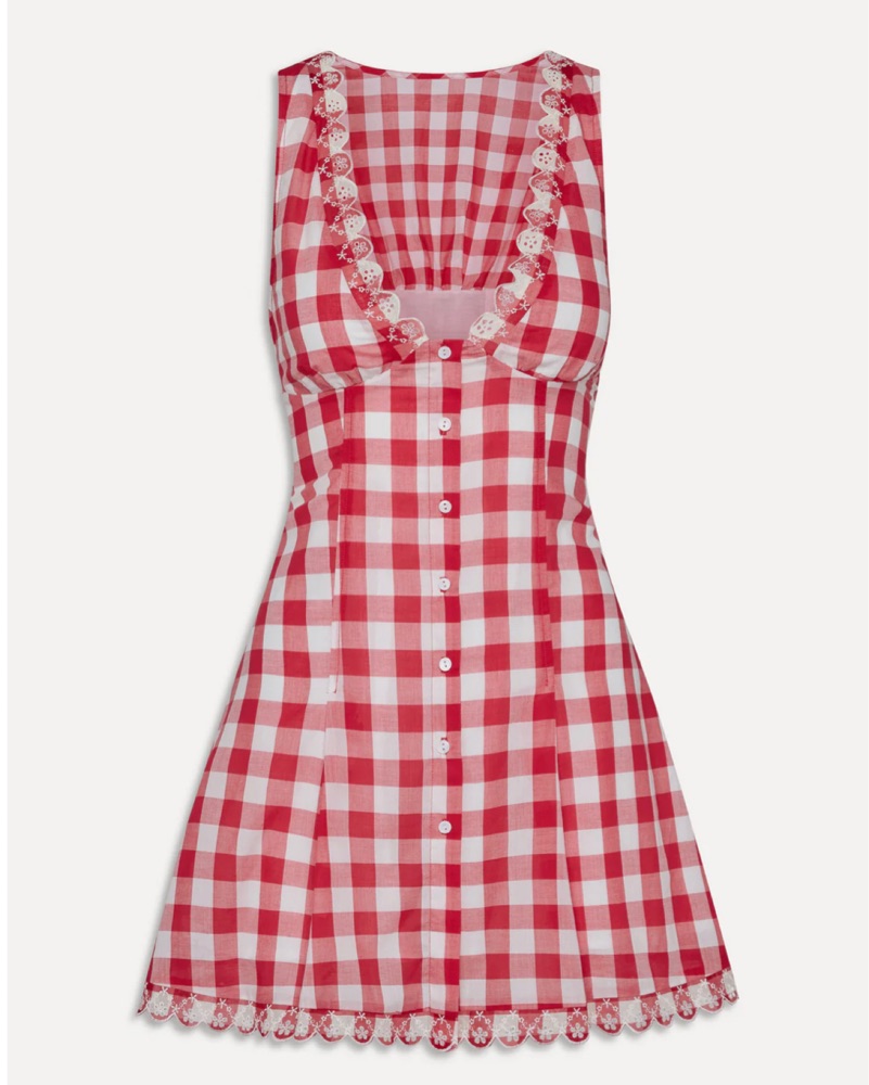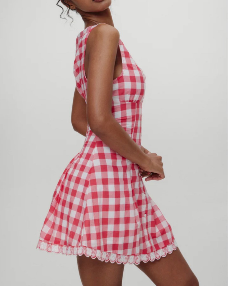 Farm gingham mini dress from the Frankies Bikinis x Bella Hadid collab. Red gingham cotton mini dress, has size zip closure and shirred detail in the back.