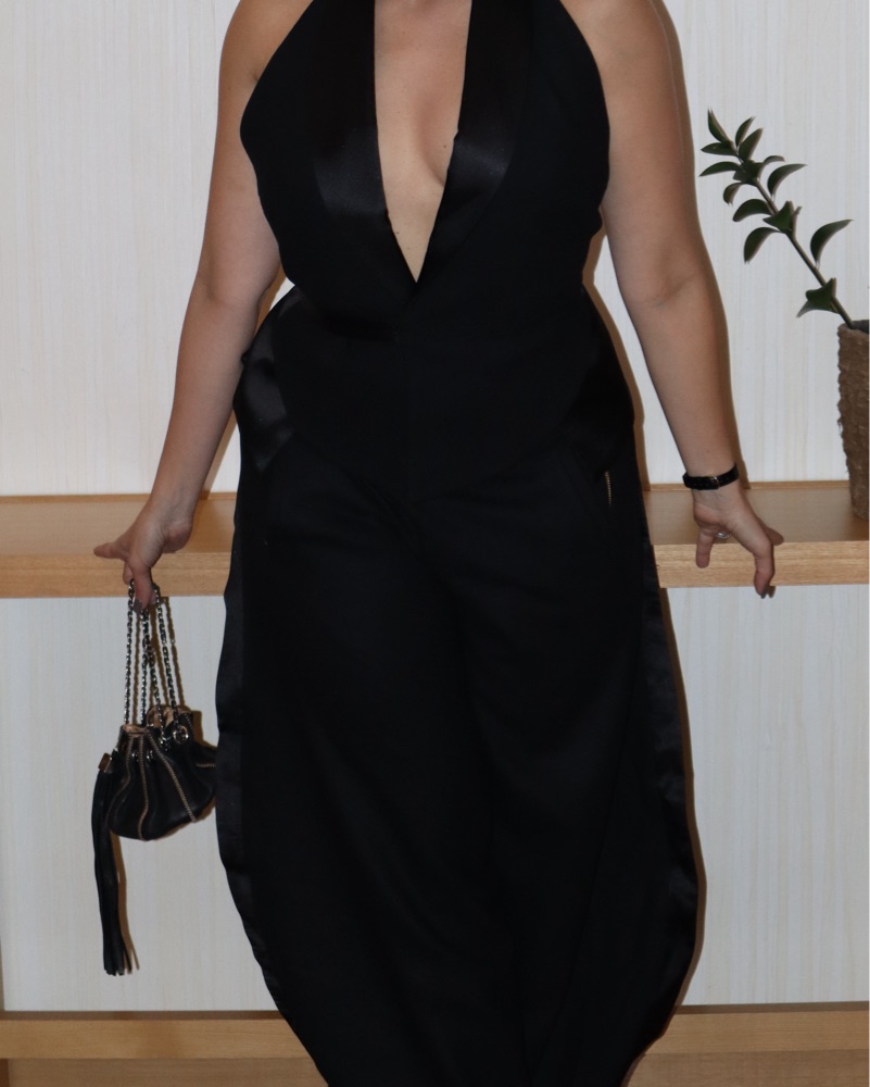 This chic tuxedo inspired black halter with Parachute pants is perfect for a night out or formal event. The deep V-neckline and sleek satin finish create a sophisticated look. I ended up wearing it with a turtle neck bodysuit but if you have the confidence to go with the girls out, do it, it’s 🔥