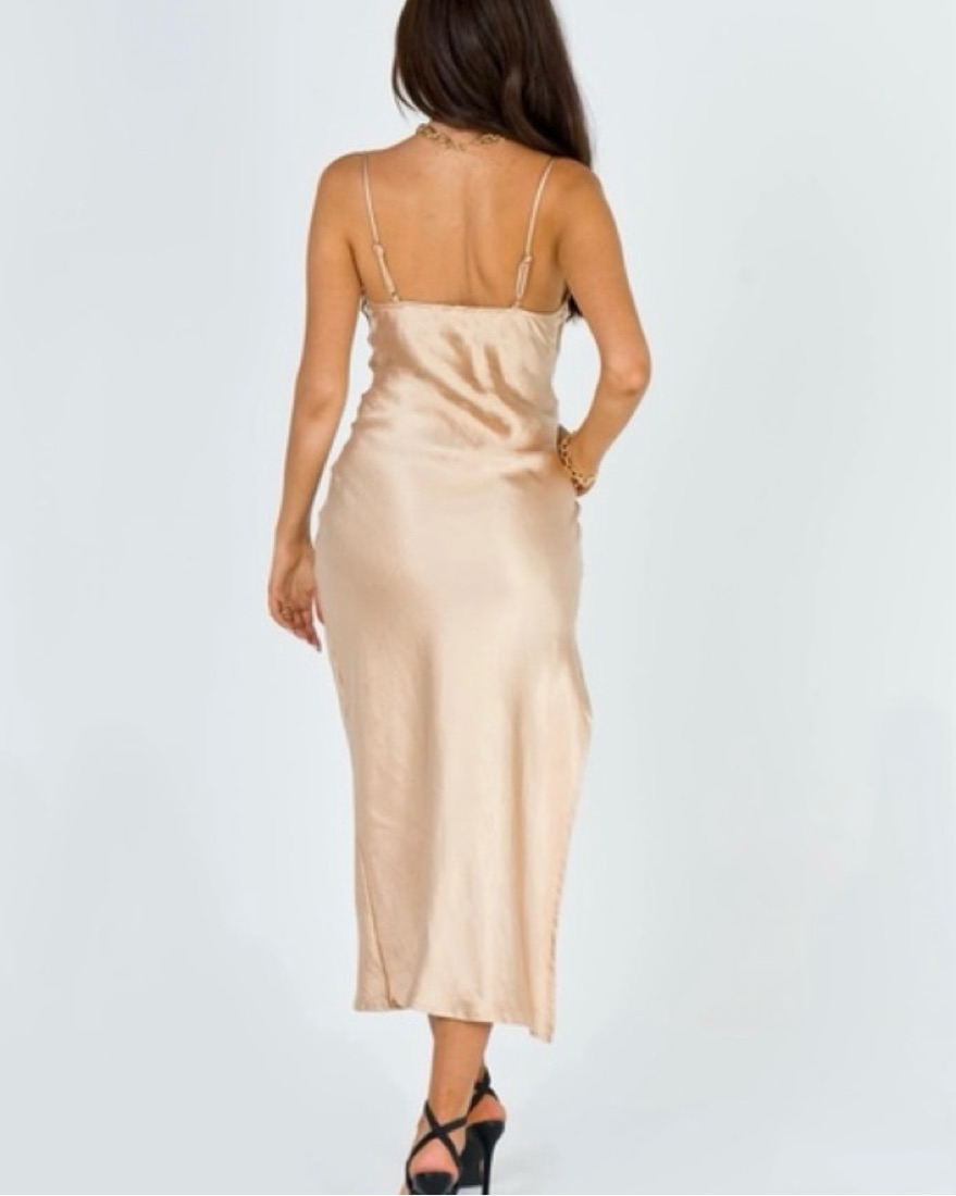 ZAMORA MIDI DRESS CHAMPAGNE - this dress is super comfortable, satin material with a slit, the straps are adjustable!