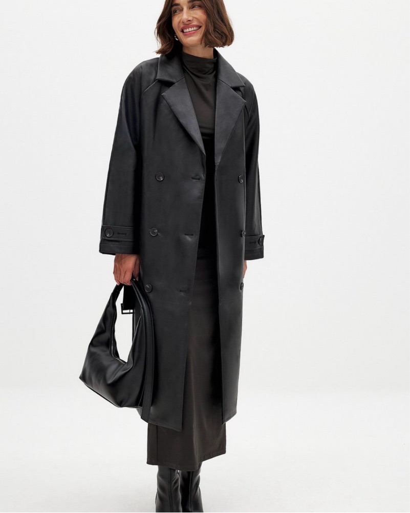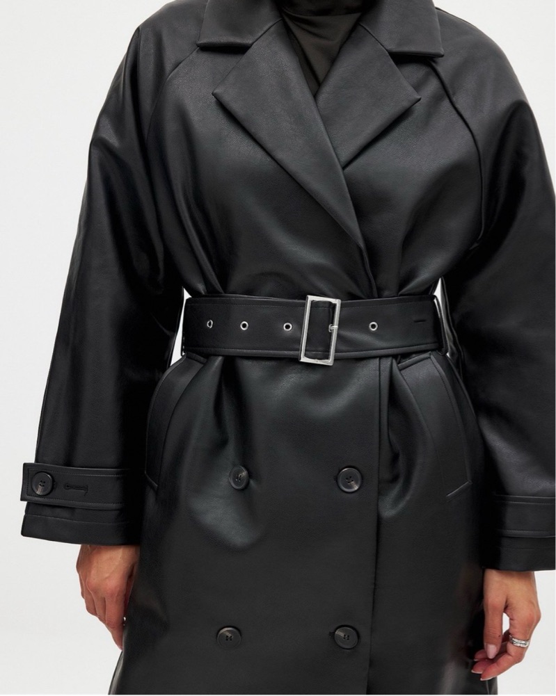 Long Black Belted Leather Trenchcoat by NA-KD - Pickle