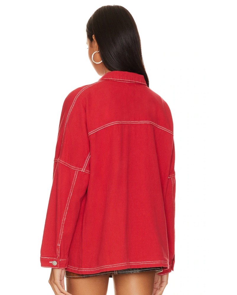 This bold red denim jacket is the perfect statement piece to elevate any casual outfit.