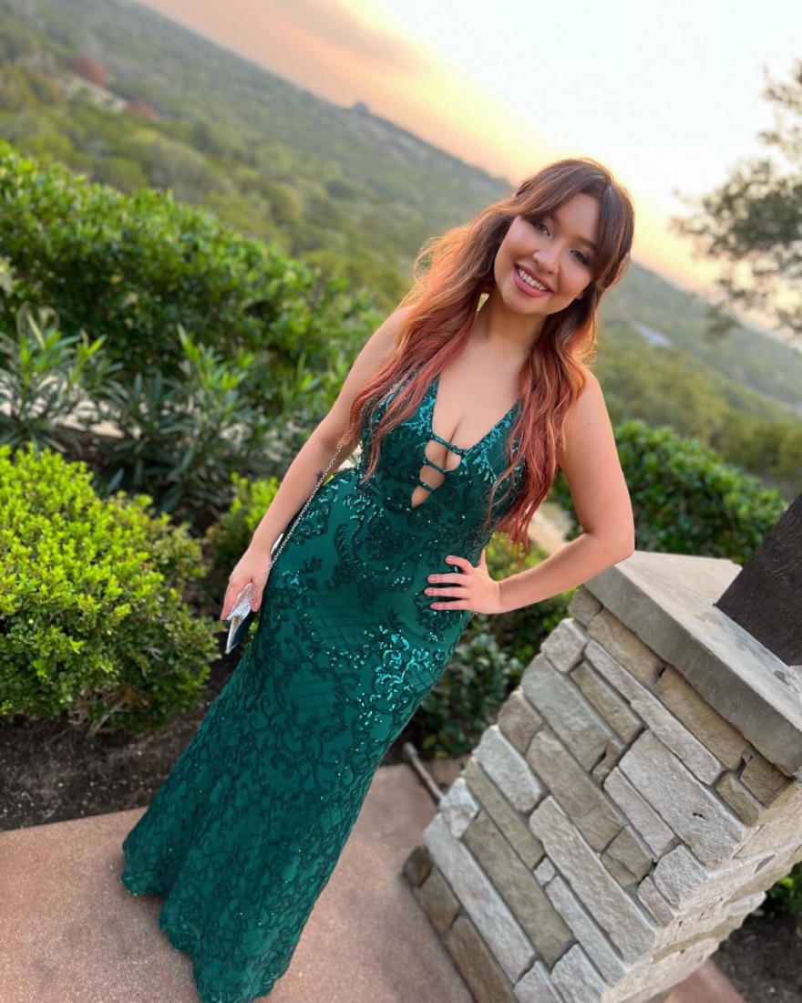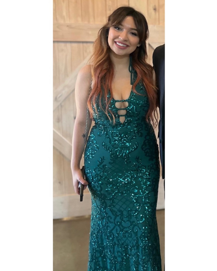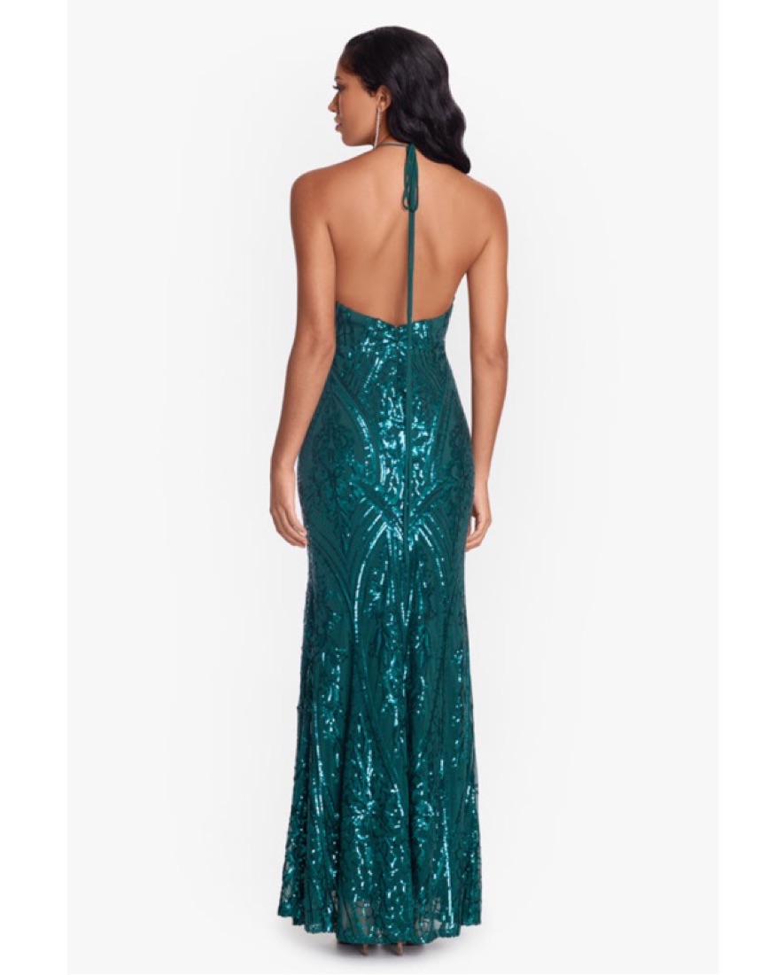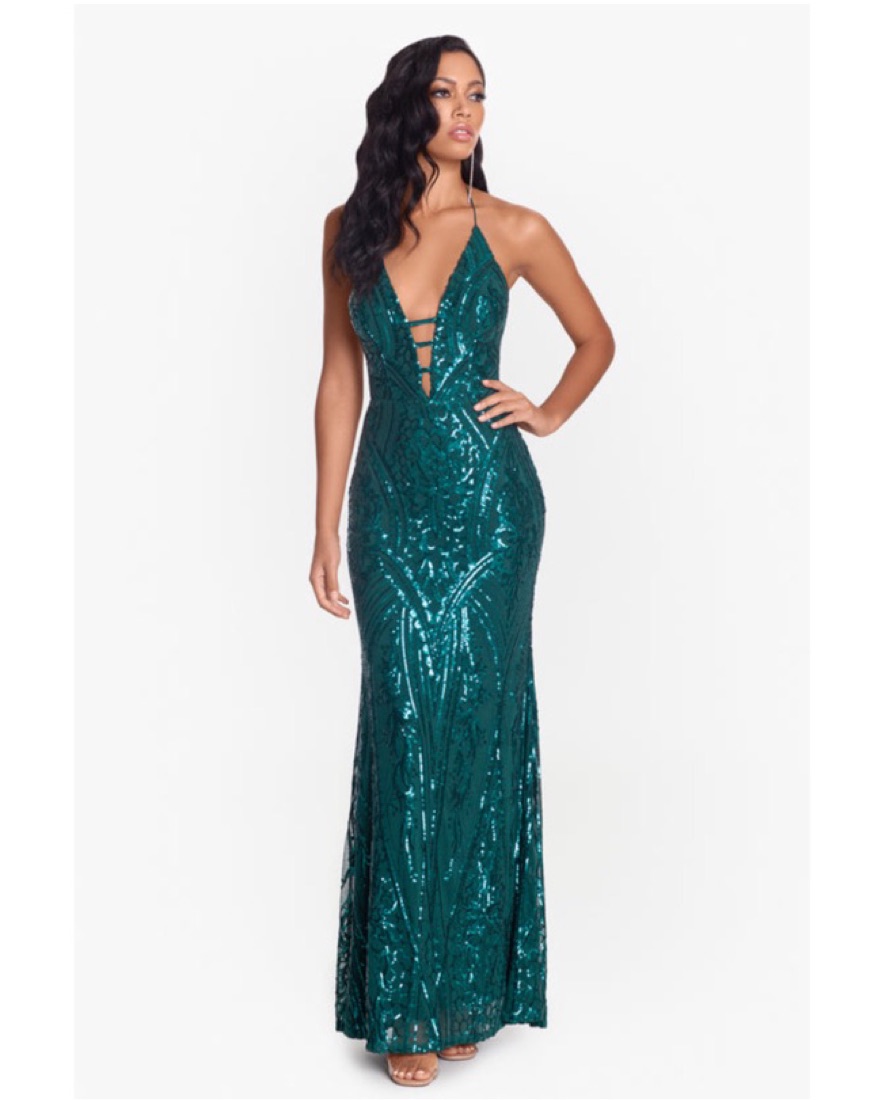 “Nora” Deep V-Neck Opulent Sequin Gown by Blondie Nites. Dress is a size 5 but thats wasn’t listed as an option so I put 6. The material is stretchy and form fitting. I wore this dress once to a wedding in February, still in mint condition! Perfect dress for weddings, formal events, prom, etc.