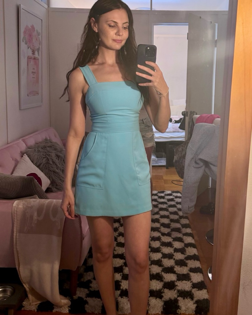 Best seller on revolve. Very flattering blue dress with pockets. A line