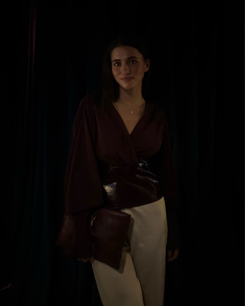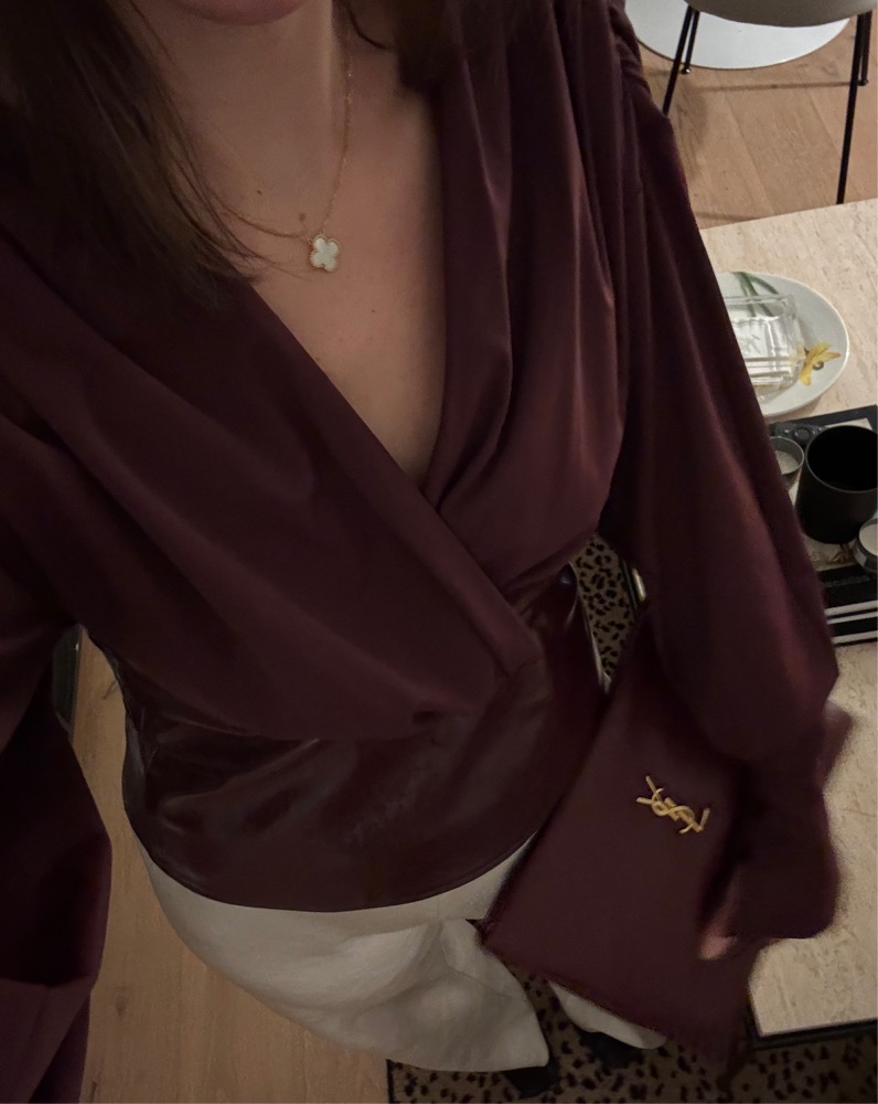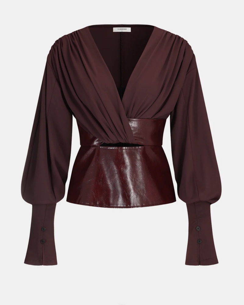 Faux Leather Panel Lantern Sleeve Blouse SPU: OA250926053