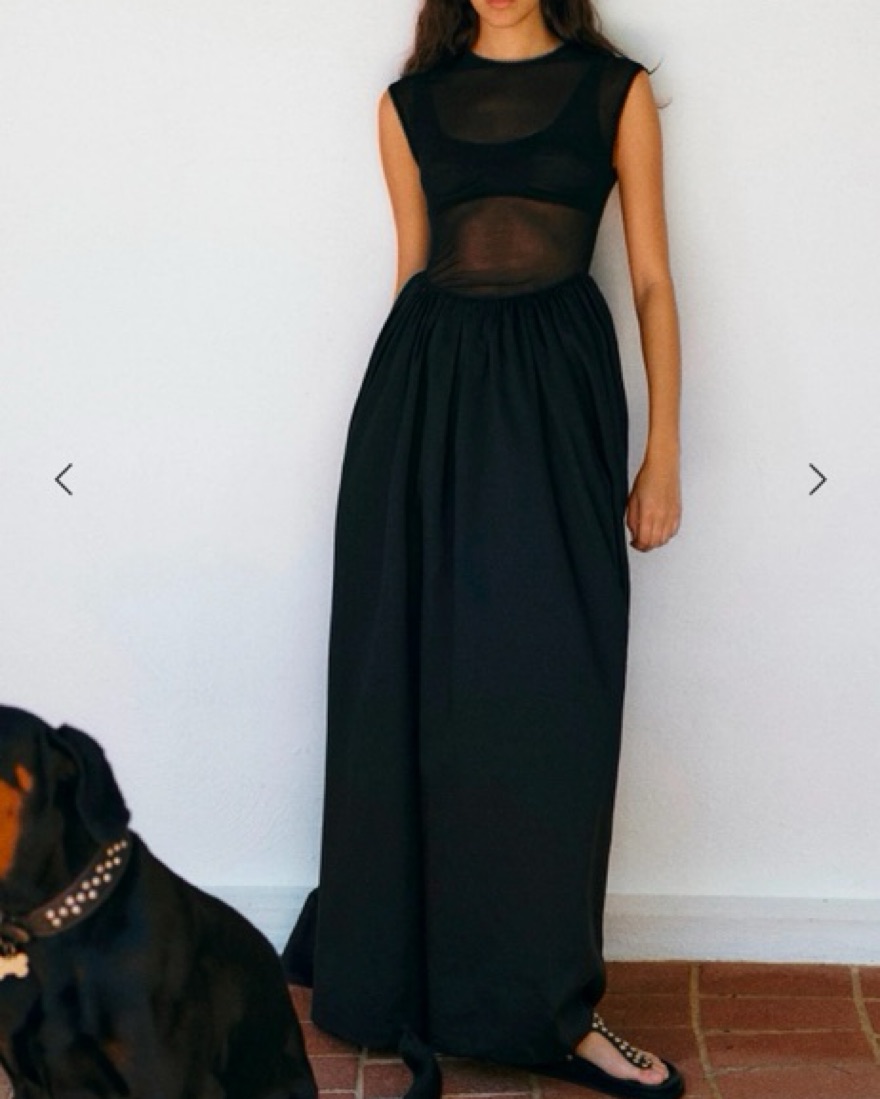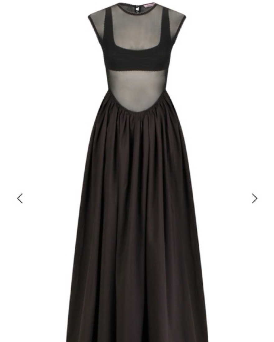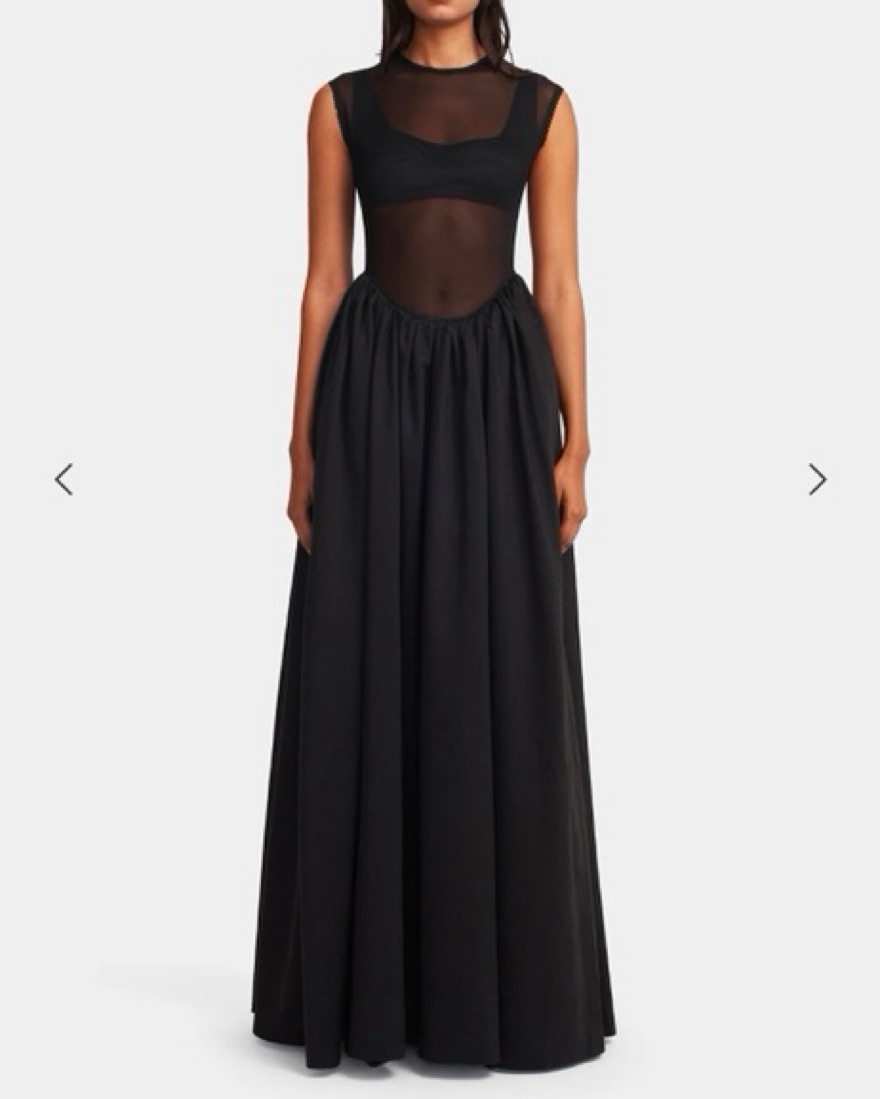 This stunning black maxi dress is perfect for a formal occasion. The sheer mesh panels and flowing skirt create a dramatic and sophisticated look.