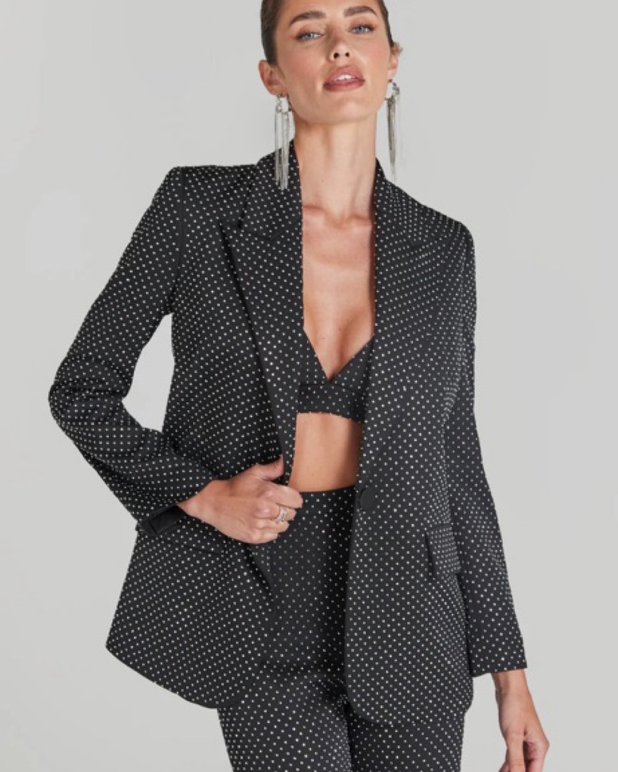 Crystal embellishment lined in beautiful satin for a smooth and comfortable fit-Single-breasted-Contrast button detailing with the matching trousers and bra top