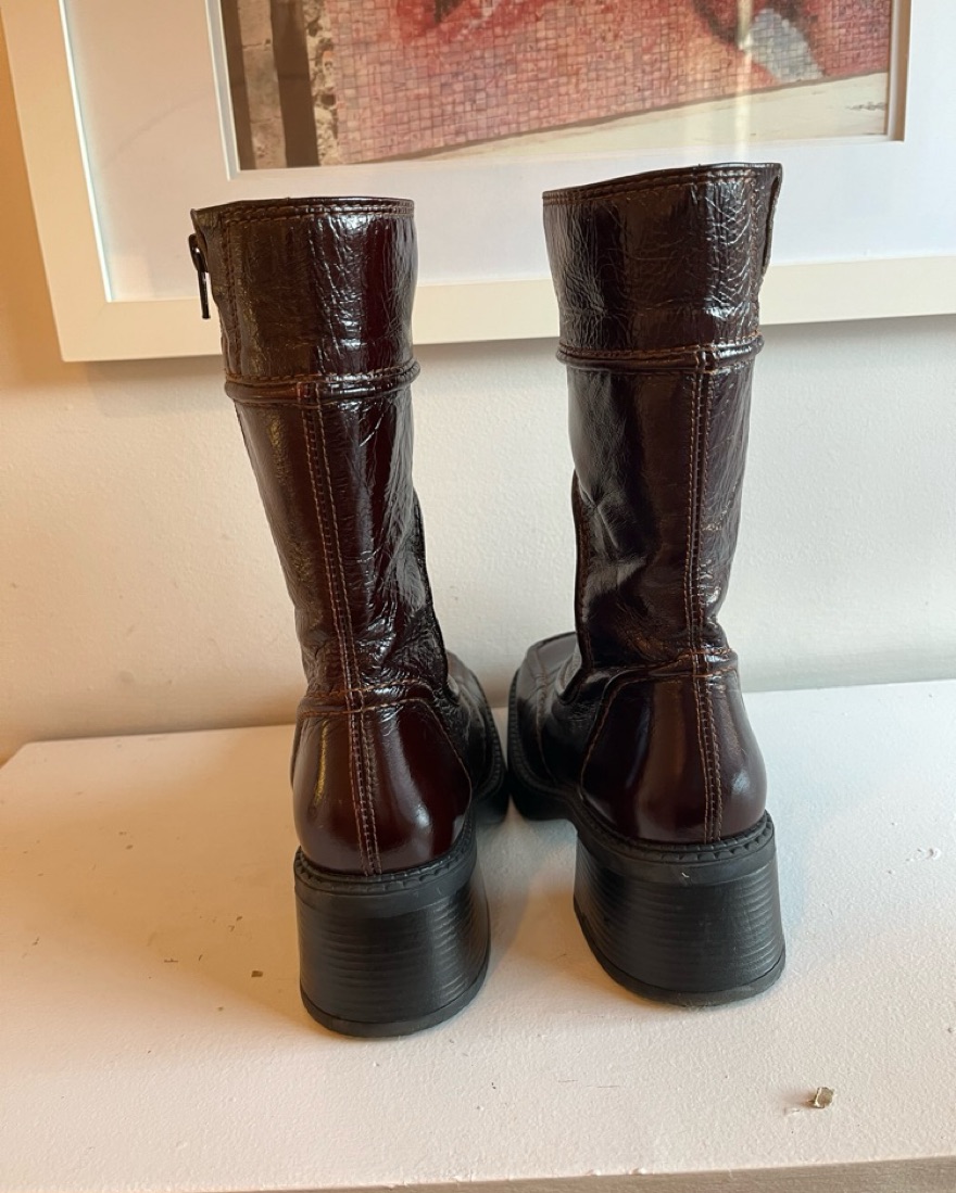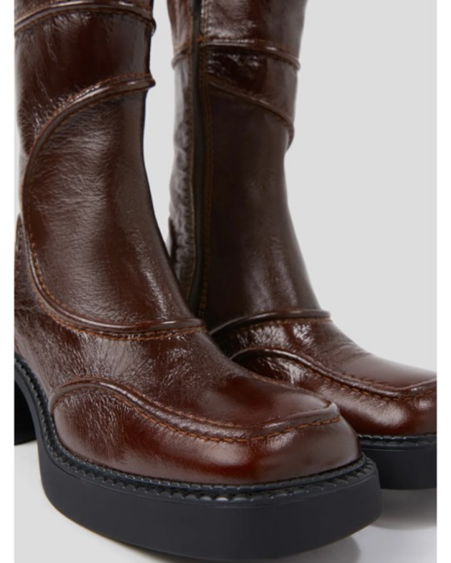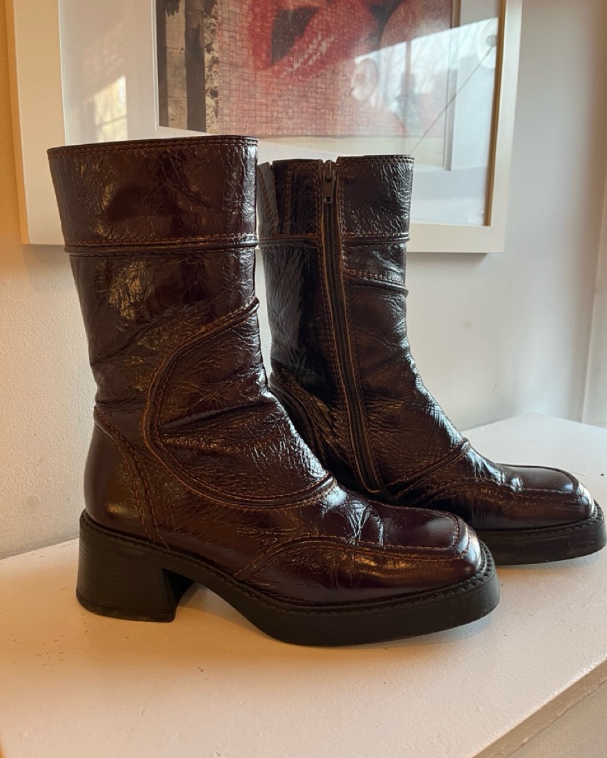 Sold out online- E8 by Miista, Malene ankle boot in burgundy. Reaches mid-calf height, I wear with skirts and tights in the winter as well as flared jeans.