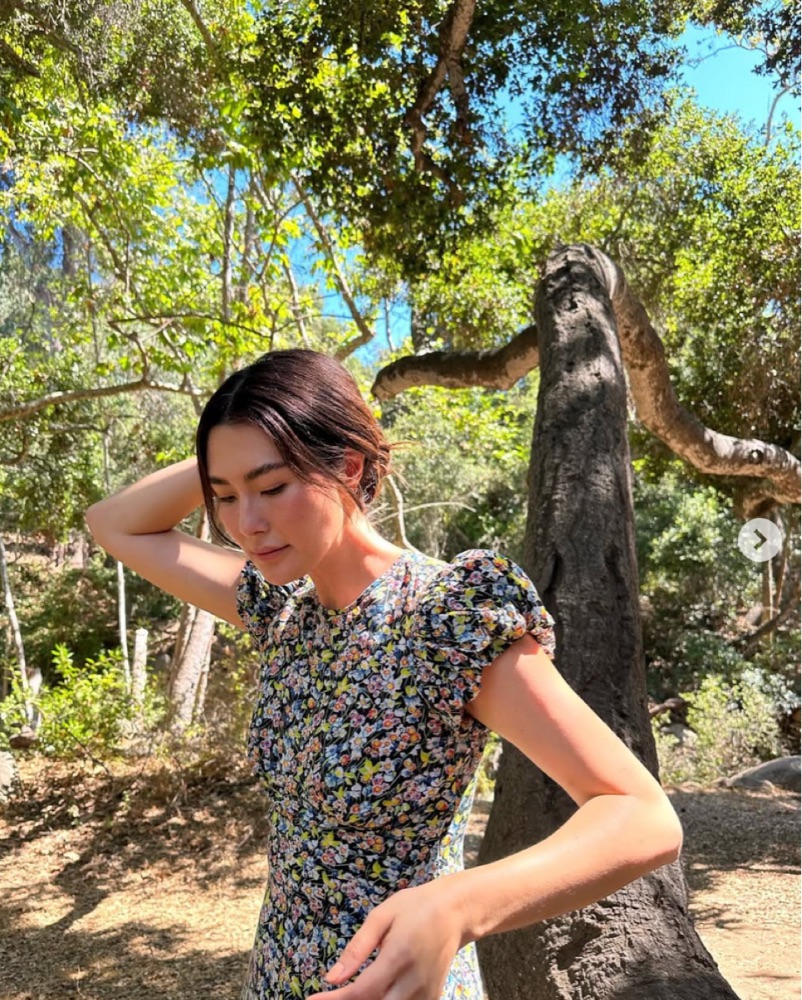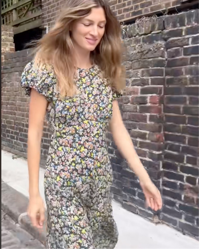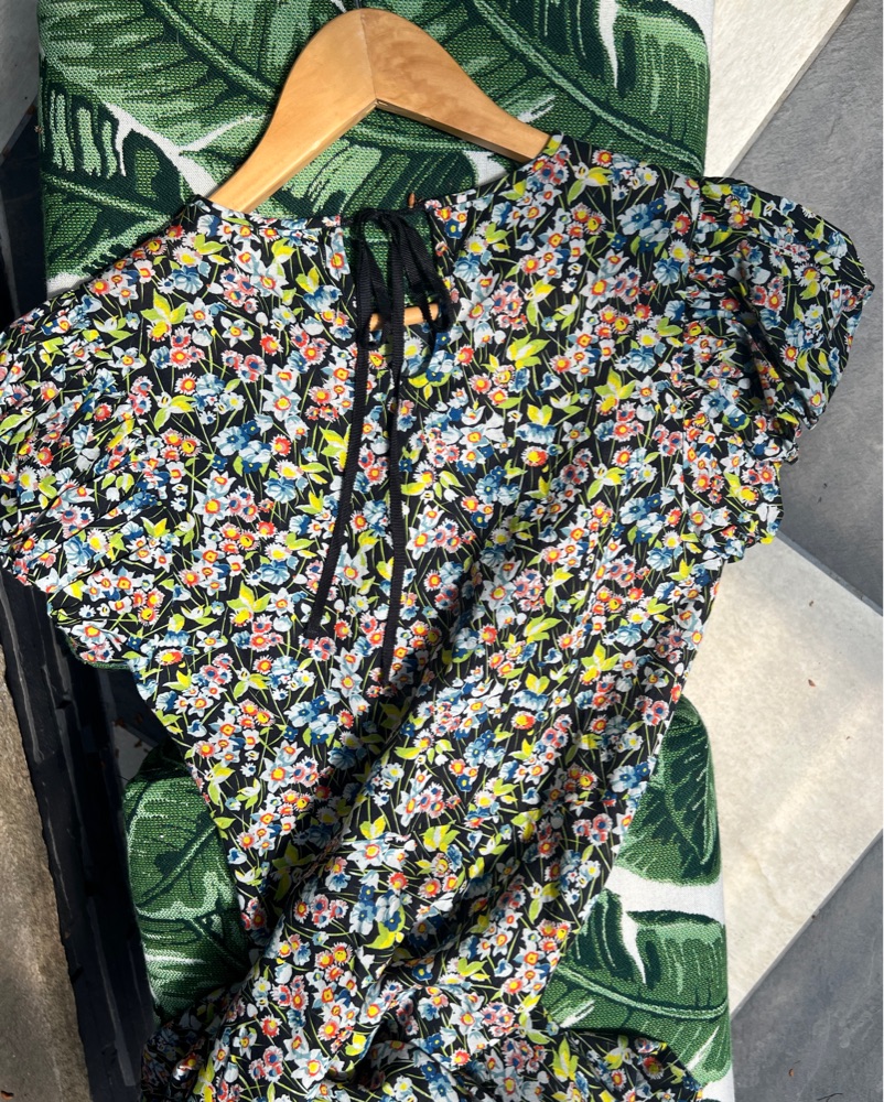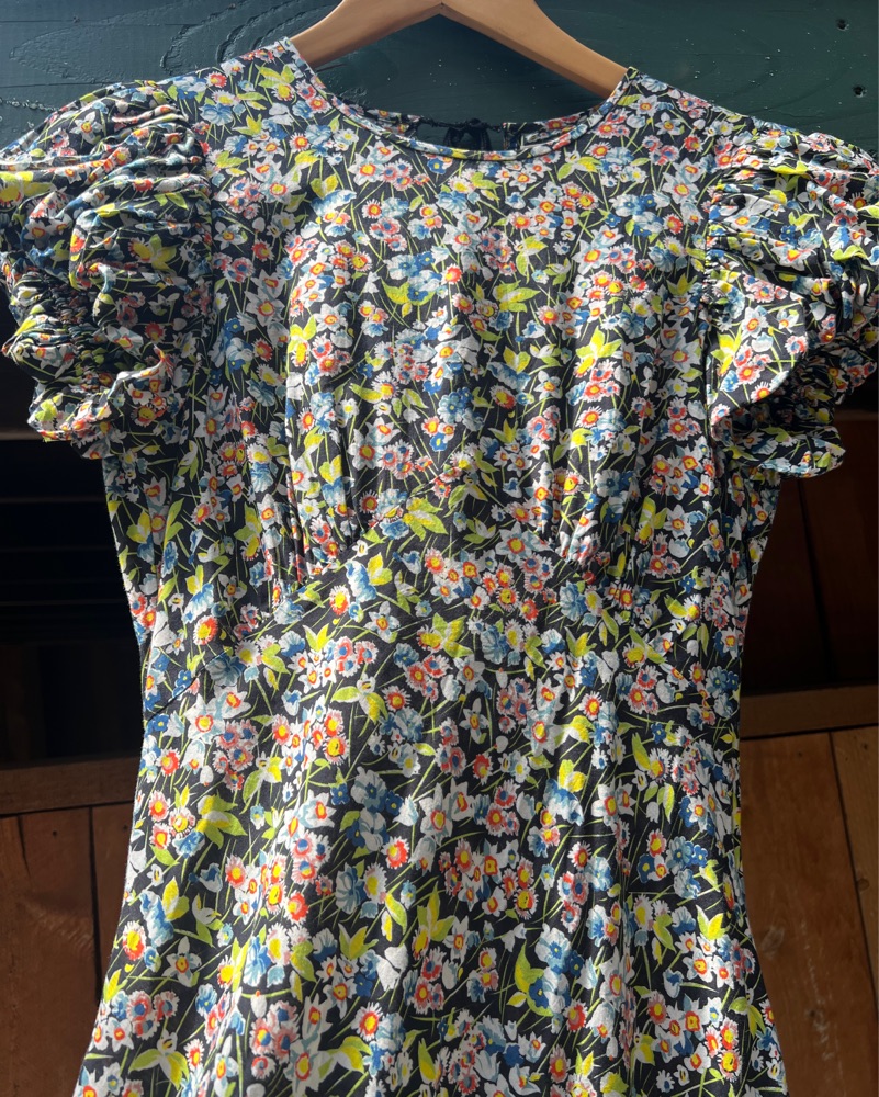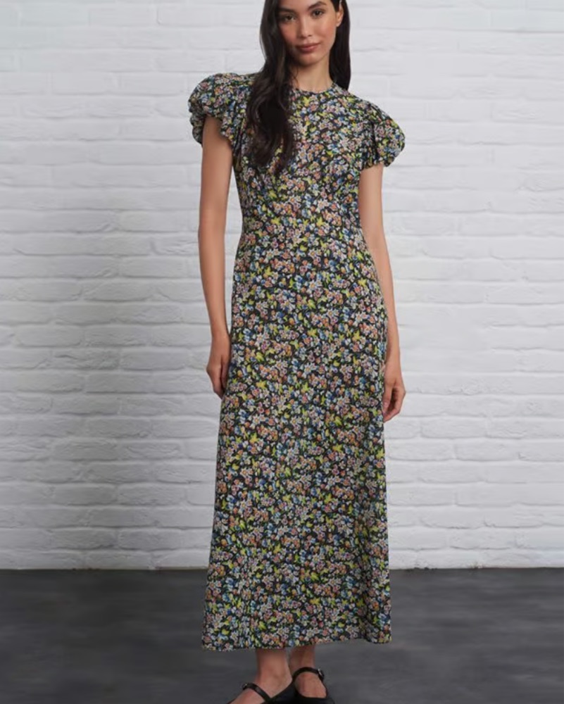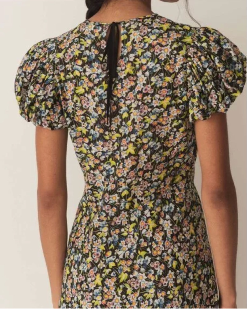 Elegant puffed sleeve long dress in Blossom Breeze ditsy floral. Invisible side zipper and pretty grosgrain ribbon tie at back neck. Style with a chic ballet flat or dress up with a heel. Perfect for Spring/Summer events. Size XS, 100% organic cotton