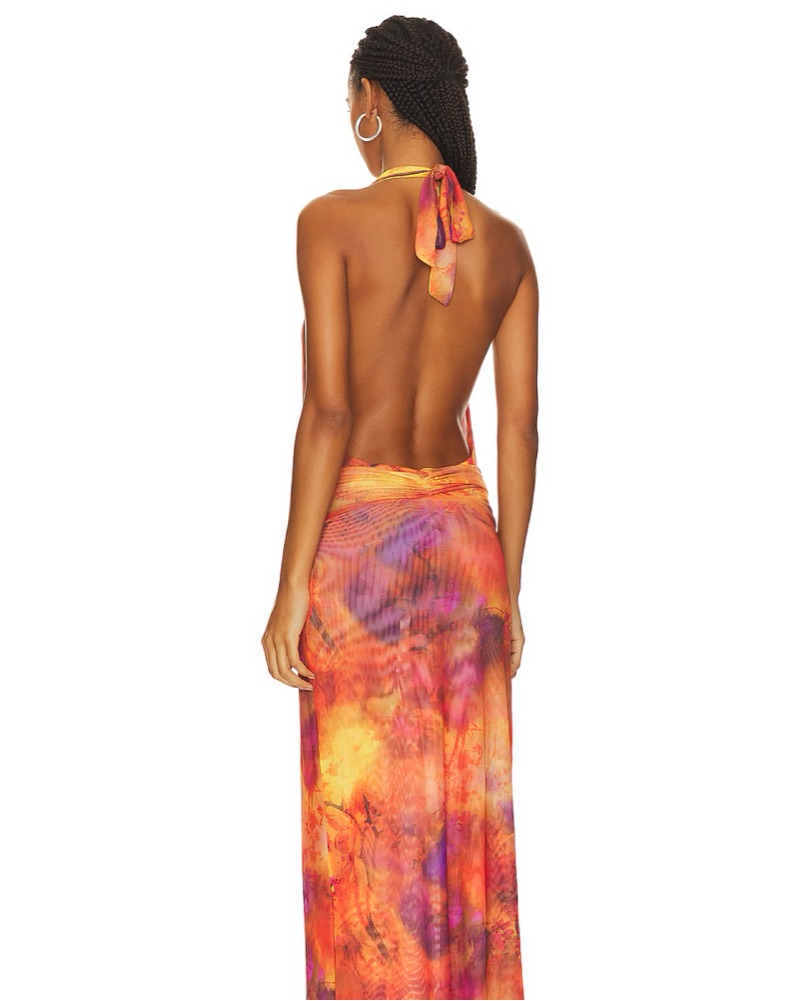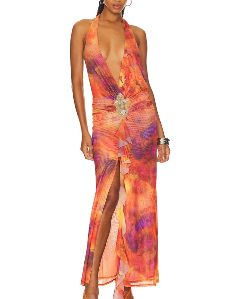 Orange floral halter maxi dress with beaded appliqué from Jaded London. Adjustable tie neck and stretchy throughout. Worn once for 5ish hrs. Fits like XS or S.
