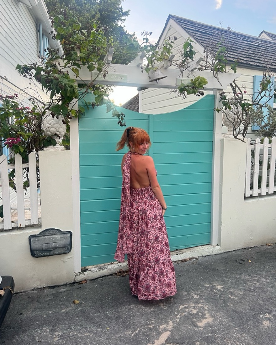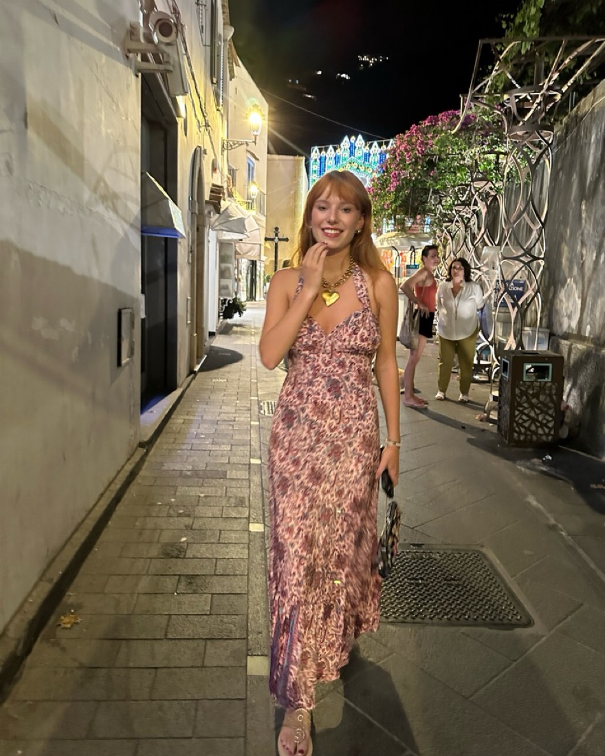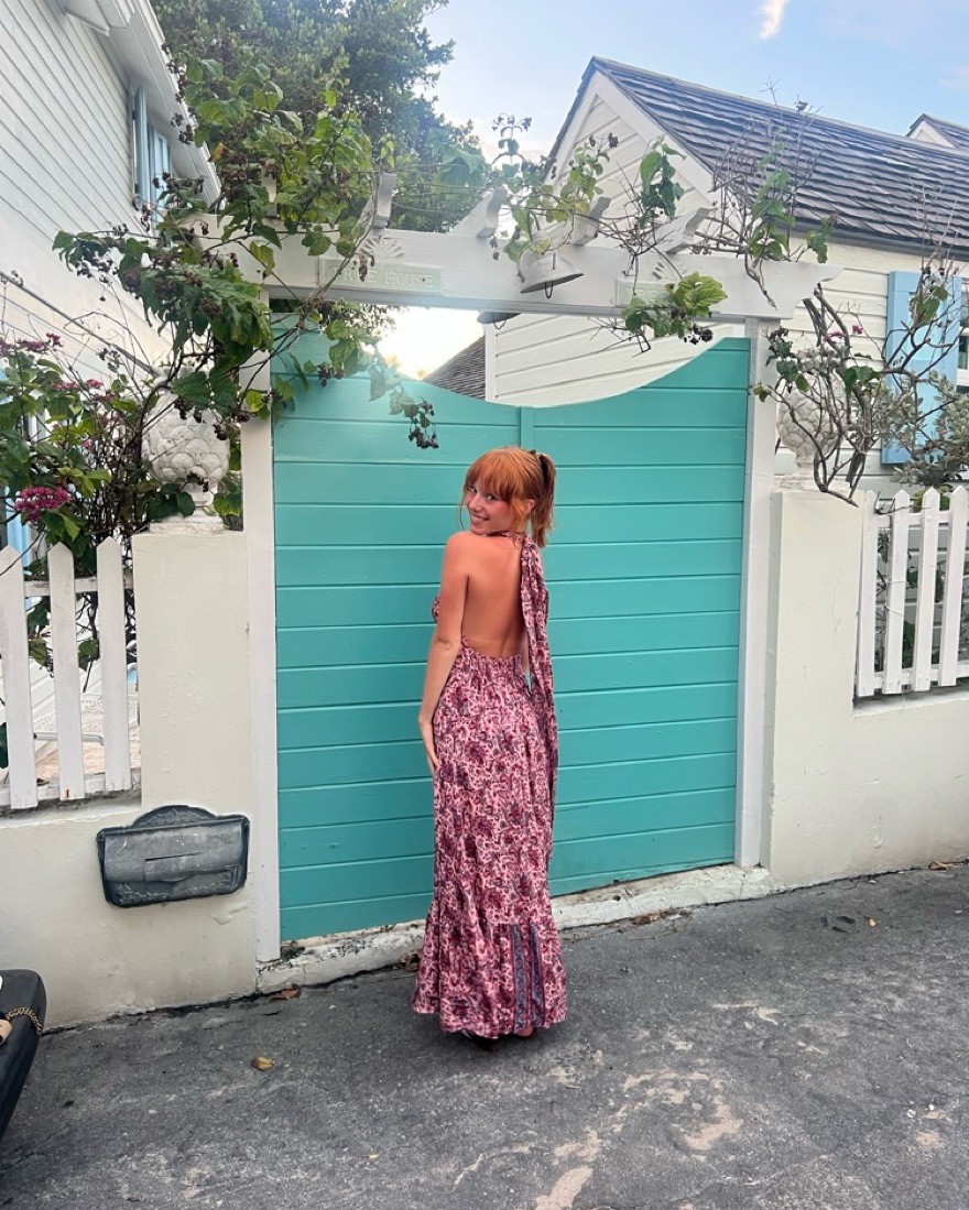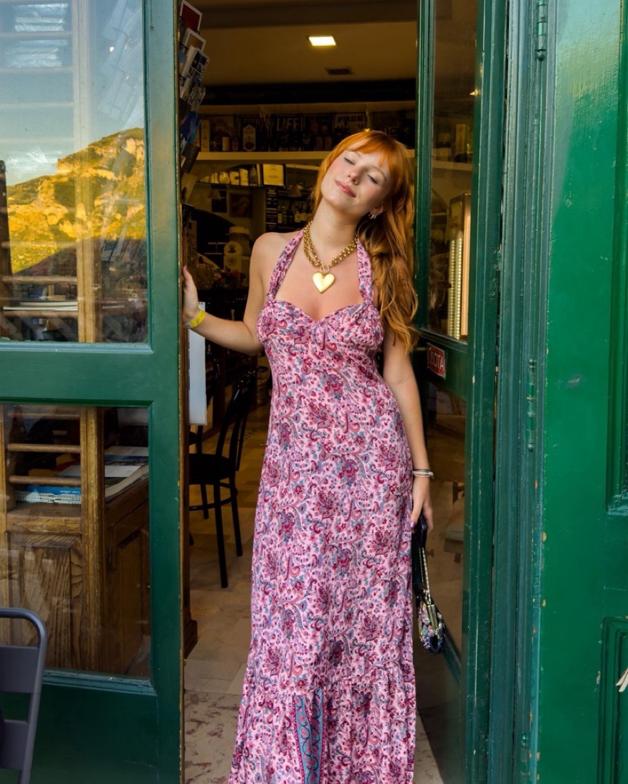 Printed pink dress handmade in India. Long strap that you can tie at back