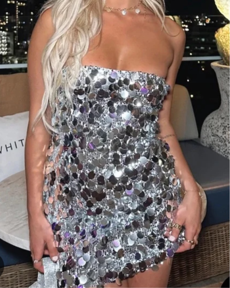 Get ready to sparkle! This jaw-dropping strapless mini dress from White Fox Boutique is covered in reflective silver sequins and discs, perfect for catching the light on every dance floor. Featuring a figure-hugging silhouette and eye-catching shimmer, this dress is the ultimate statement piece!