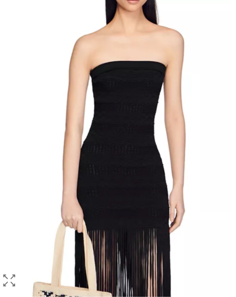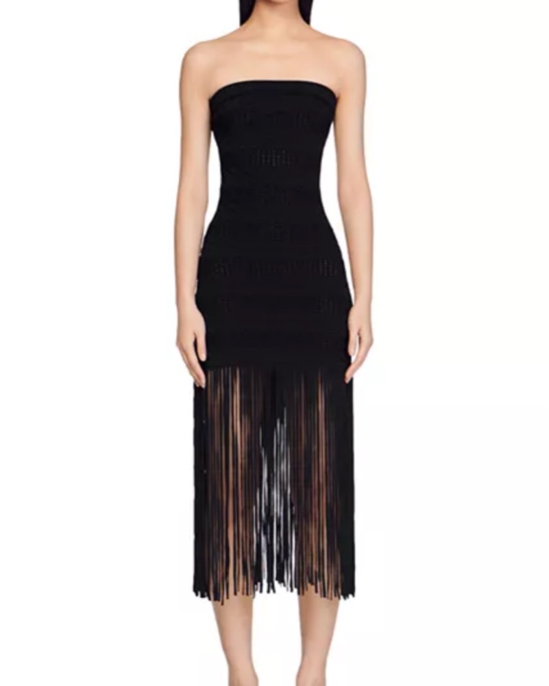 This sultry black fringe midi dress is perfect for a night out on the town. The figure-hugging silhouette and dramatic fringe detailing create a chic and sophisticated look.