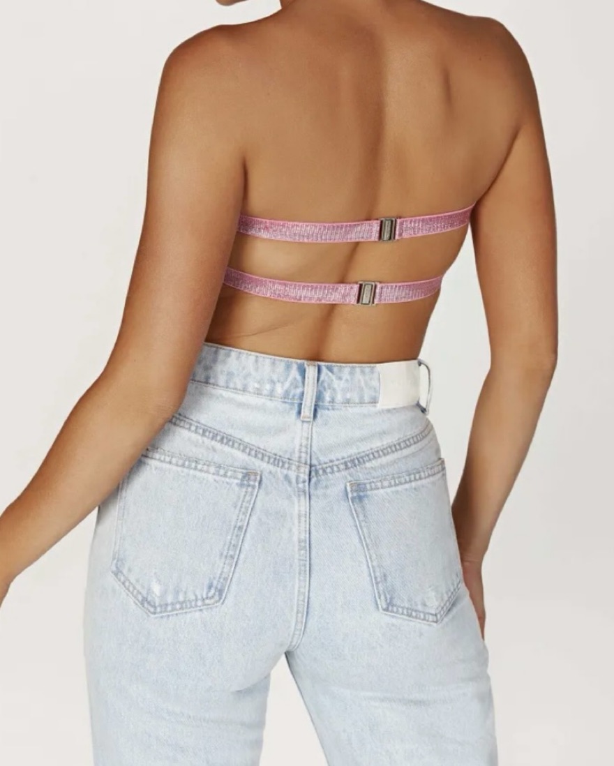 A strapless cropped bandeau top with rhinestones and custom clasps, designed with double-glittered elastic straps at the back.