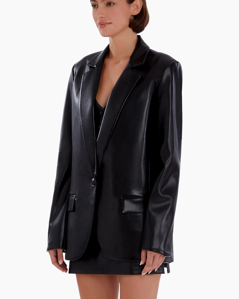 Sleek faux leather blazer with a relaxed, structured fit. Features a notch collar, single covered button closure, and front flap pockets.