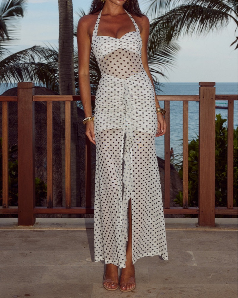 This chic polka dot dress is perfect for a stylish beach getaway or a night out on the town. The halter neckline and flowing wide-leg silhouette create a flattering, feminine look.