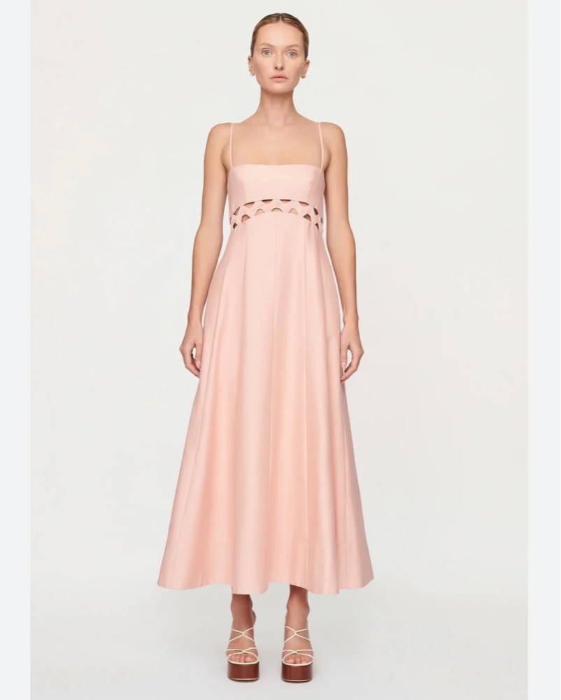 This blush midi dress is perfect for a special occasion. The clean lines and subtle cutouts create a flattering, sophisticated look. Super flattering and sturdy/well made!