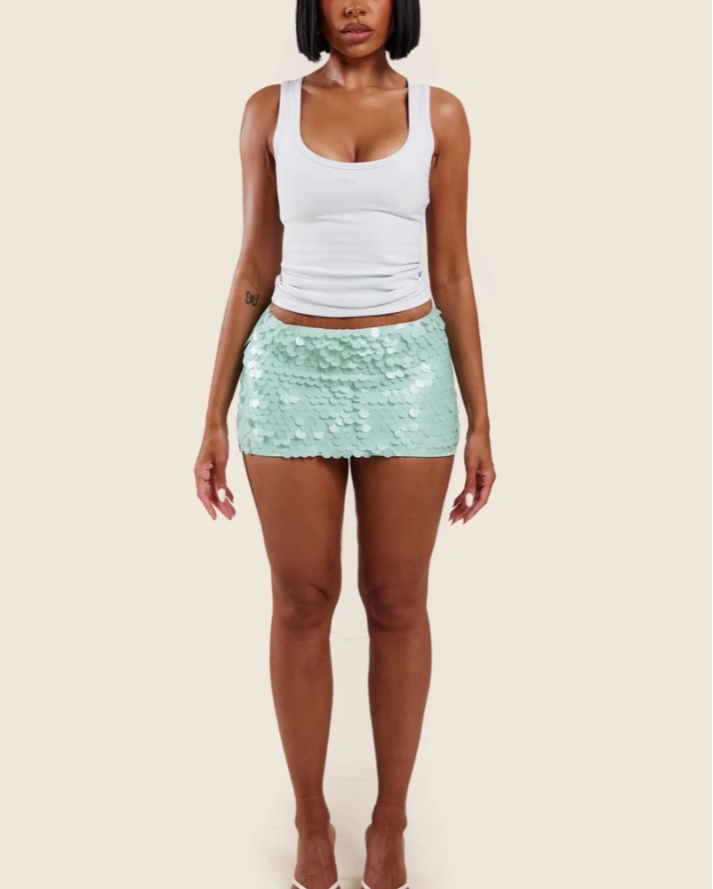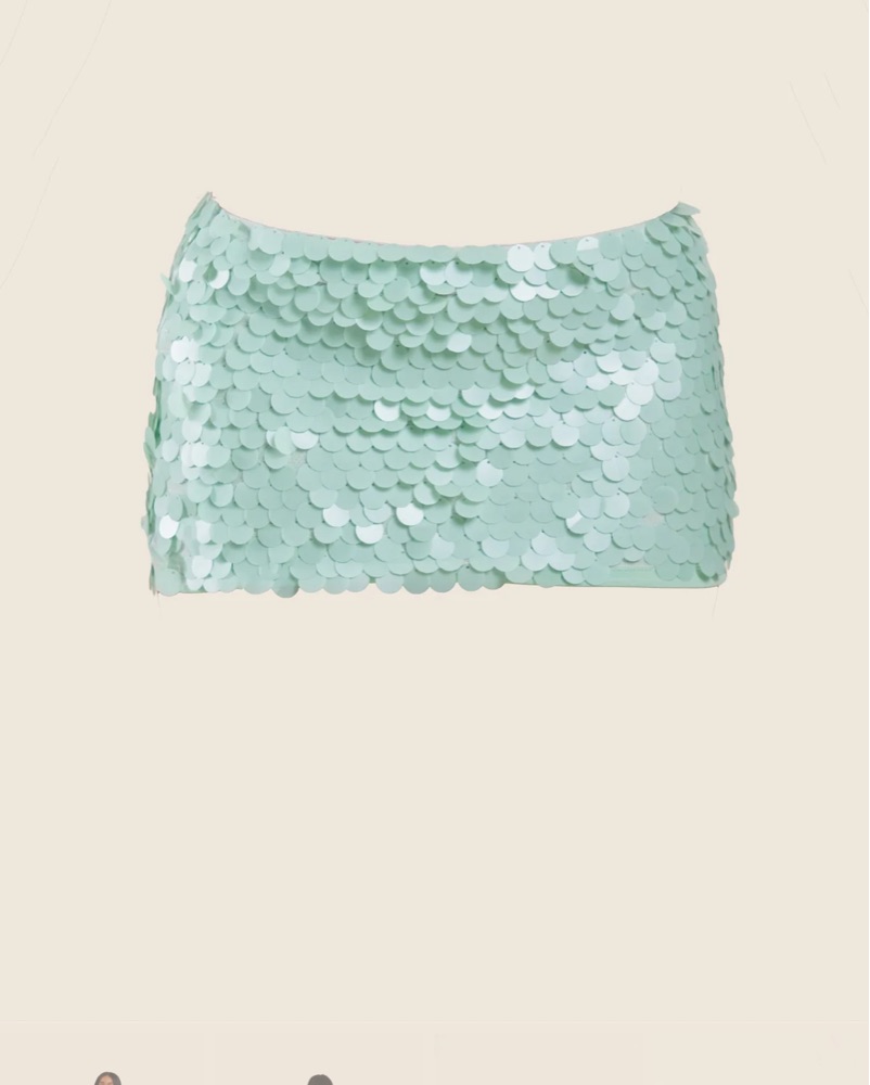 turquoise blue mini sequin skirt. This is marked a UK12 which according to the size chart is a US8. I would say it fits more like a US10. For reference, I am a true medium and usually an 8 in bottoms. This is a bit roomy on me