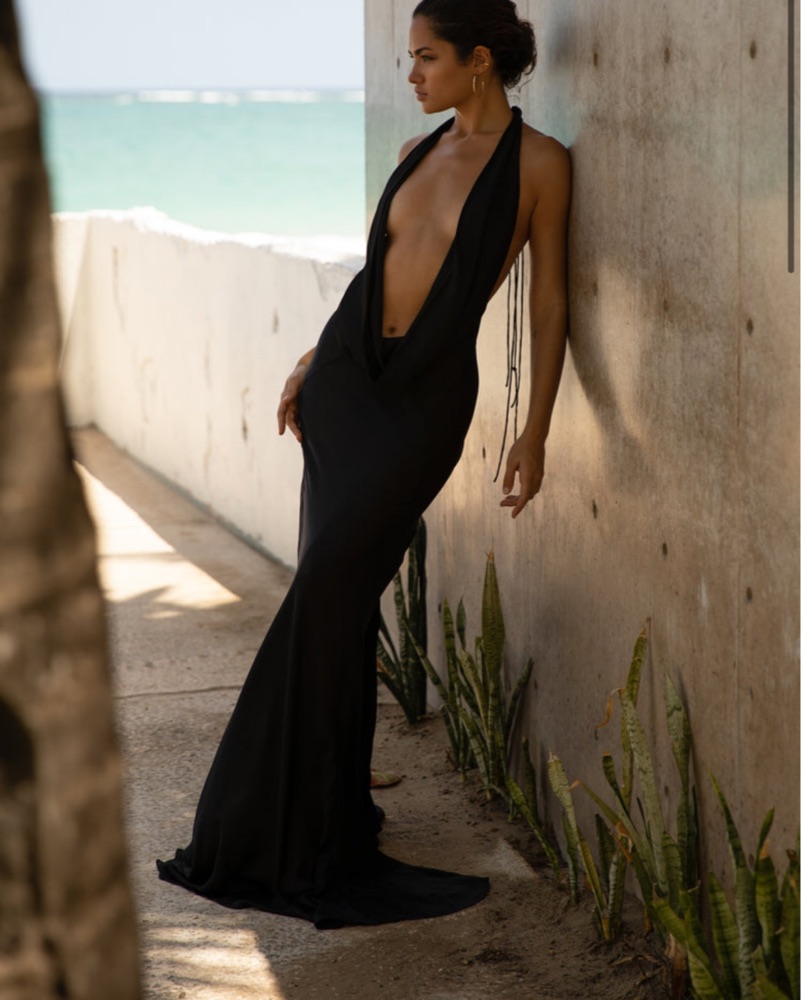 Deep front cowl Maxi length with wide hem Backless Self tie halter fastening