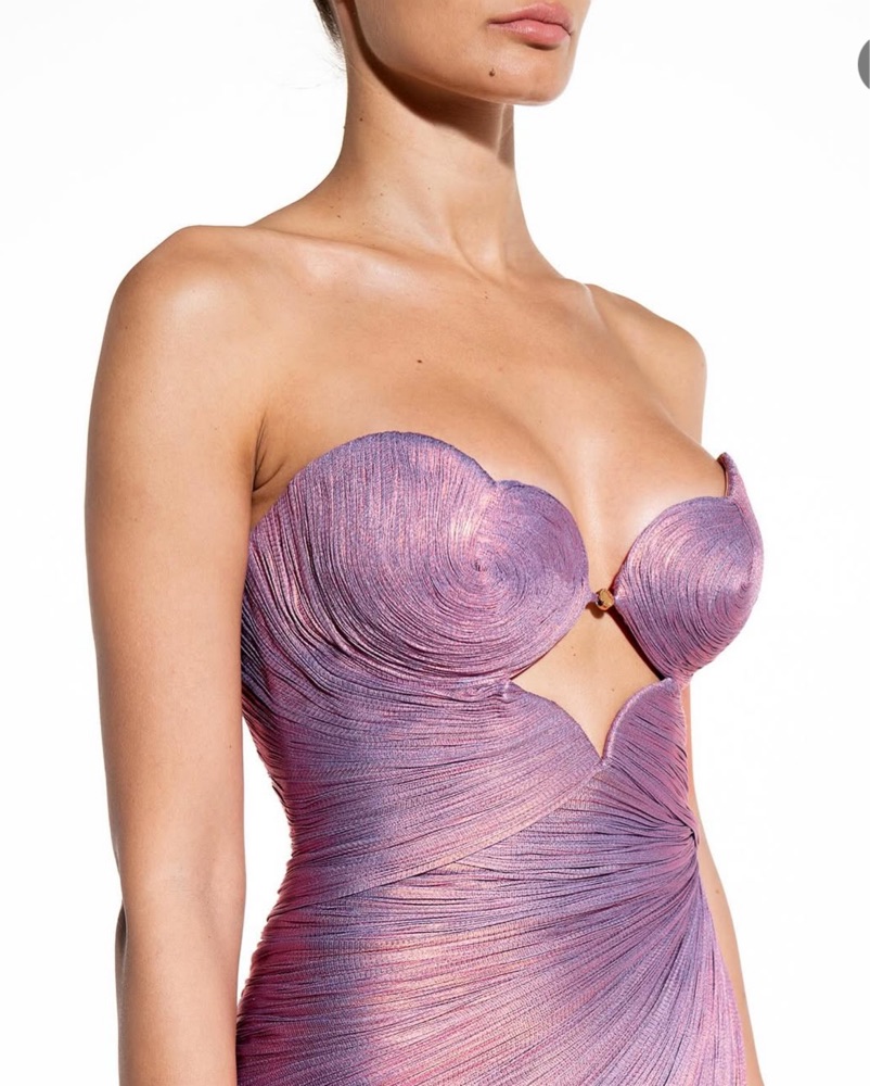 This stunning gown is perfect for a formal event or special occasion. The intricate pleated and draped design creates a truly captivating look.